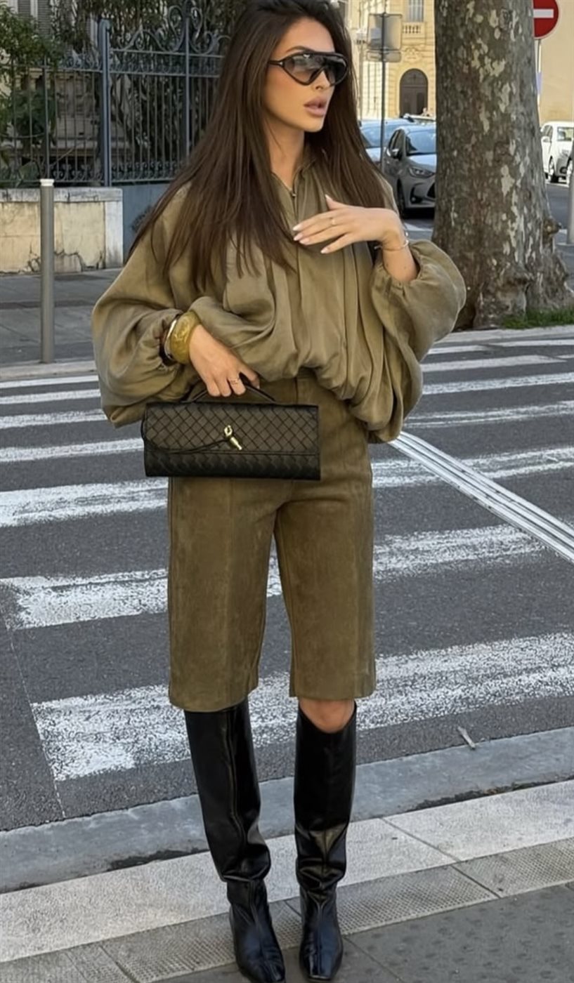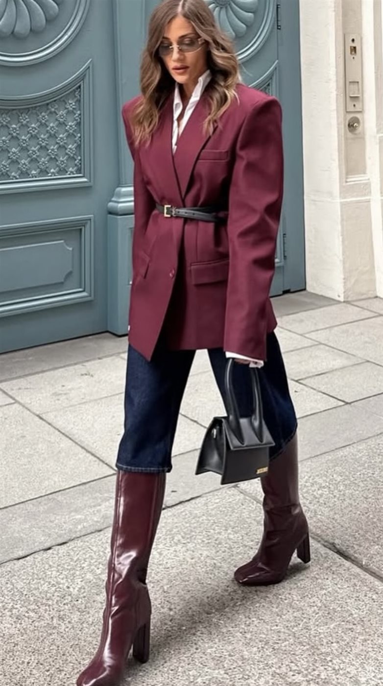 - البوت العالي (Over-the-Knee): يمنح الإطلالة طابعاً فاخراً وجريئاً، ويمكن تنسيقه مع سترة جلدية أو معطف طويل لإطلالة متوازنة بين القوة والأنوثة.