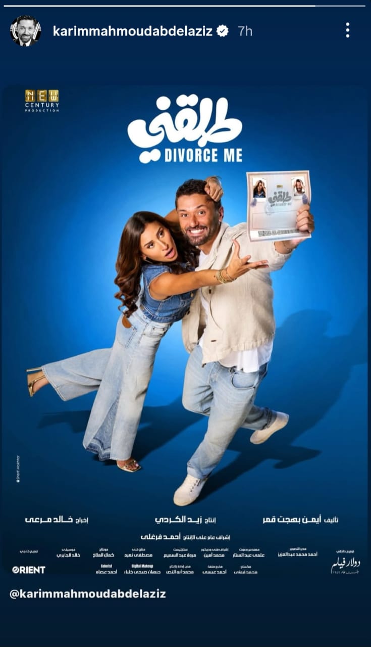 نشر النجم كريم محمود عبد العزيز البوستر الرسمي لفيلمه الجديد “طلقني” عبر خاصية القصص القصيرة على إنستجرام تمهيدا لبدء الترويج للعمل.