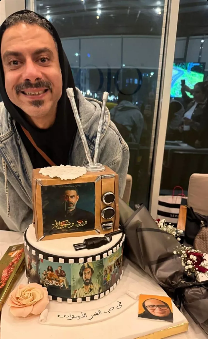وظهرت بسنت شوقي خلال الصور رفقة محمد فراج، وهما ممسكان بتورتة عيد الميلاد والتي حملت بوسترات أشهر أعماله ومن بينها شاشة تلفزيون والتي تحمل بوستر مسلسل “ورد وشوكولاتة”، وبجانب بوسترات أعماله الفنية ظهرت صورة صغيرة لوالدة الإعلامية شيماء جمال.