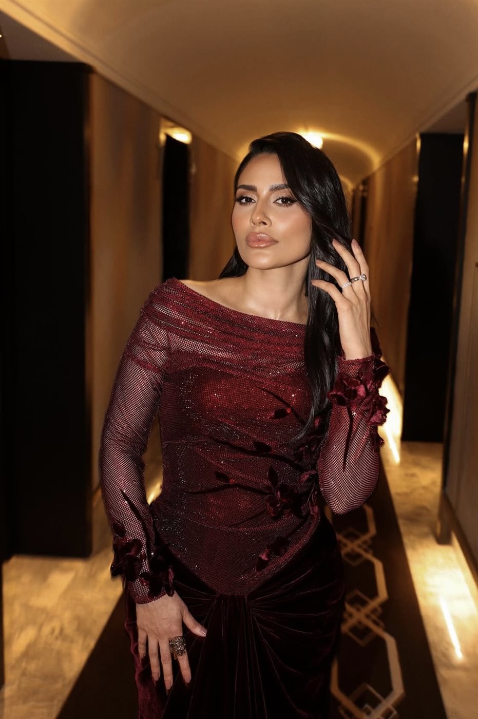 إلهام علي تألقت بفستان مُفصّل خصيصًا لها من توقيع Antoine Kareh Couture، جاء بتصميم يجمع بين الفخامة والدراما الهادئة. الجزء العلوي للفستان صُمّم من قماش مشغول بالترتر الناعم بتدرجات الأحمر العميق، مع خامة شفافة مزيّنة بلمسات لامعة أبرزت منطقة الكتفين والذراعين بطريقة أنيقة دون مبالغة. أما الجزء السفلي فكان من قماش القطيفة الفاخر بدرجة البرغندي الداكن، ينساب بانسيابية راقية تمنح القوام طولًا وأناقة إضافية، مع طيّات دقيقة عند الخصر تُبرز جمال القصة وتضيف عنصرًا بصريًا جذابًا.