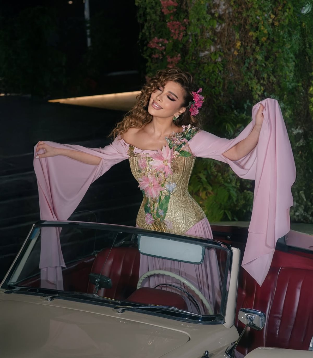 ظهرت أصالة في الصور بإطلالة وردية حالمة بتوقيع houidabaridi ارتكزت على فستان طويل بتصميم فريد يجمع بين اللمسات الشرقية والكلاسيكية بأسلوب أنثوي أنيق. جاء الفستان بلون وردي باستيلي ناعم يضيف إلى حضورها طابعاً رقيقاً ومشرقاً، بينما تميّز الجزء العلوي من الفستان بكورسيه ذهبي مشغول يدوياً، مصمم بطريقة تعزز نحافة الخصر وتمنح الإطلالة فخامة ملكية واضحة. وقد تداخلت على الكورسيه تطريزات دقيقة بأشكال أوراق وأزهار تتناغم مع أجواء الطبيعة التي تحيط بجلسة التصوير، ما جعله نقطة الارتكاز الجمالية في اللوك بأكمله.