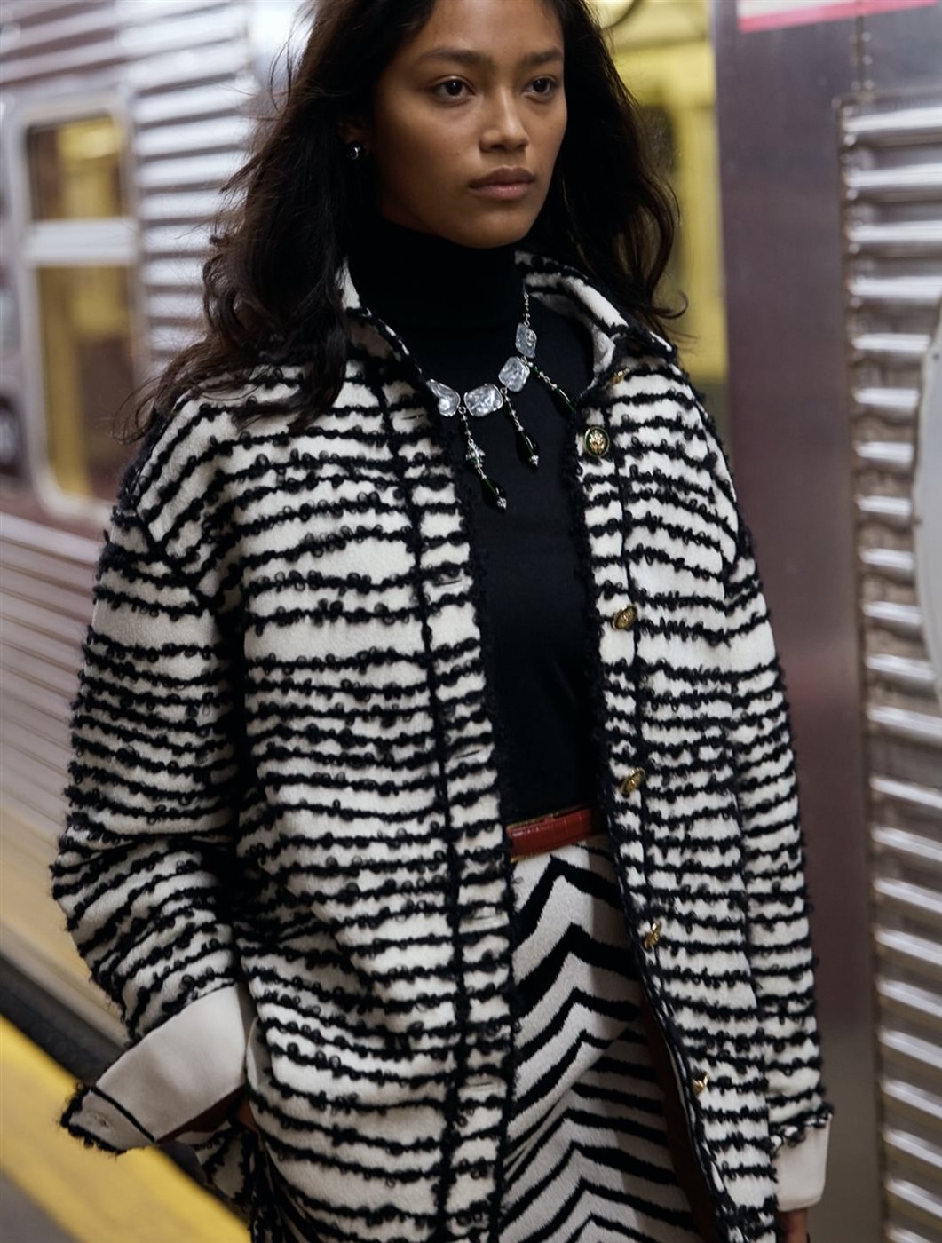 وقد استهلت شانيل مجموعتها بفكرة “الأناقة اليومية أثناء التنقّل”، لتبرهن أن الموضة ليست مقتصرة على المناسبات الراقية فقط، بل يمكن أن تكون جزءًا من الحركة اليومية. أولى القطع اللافتة كانت تنورة التويد الكلاسيكية لكن هذه المرة بتأثير trompe l’œil الذي يمنحها مظهر الدنيم، في مزيج يغيّر تجربة التويد التقليدية ويمنحها نفسًا عصريًا غير متوقع. هذا المزج بين الخامة التراثية والتأثير البصري المبتكر يعبّر بوضوح عن توقيع بليزي الذي يميل إلى خلط الواقع بالوهم.