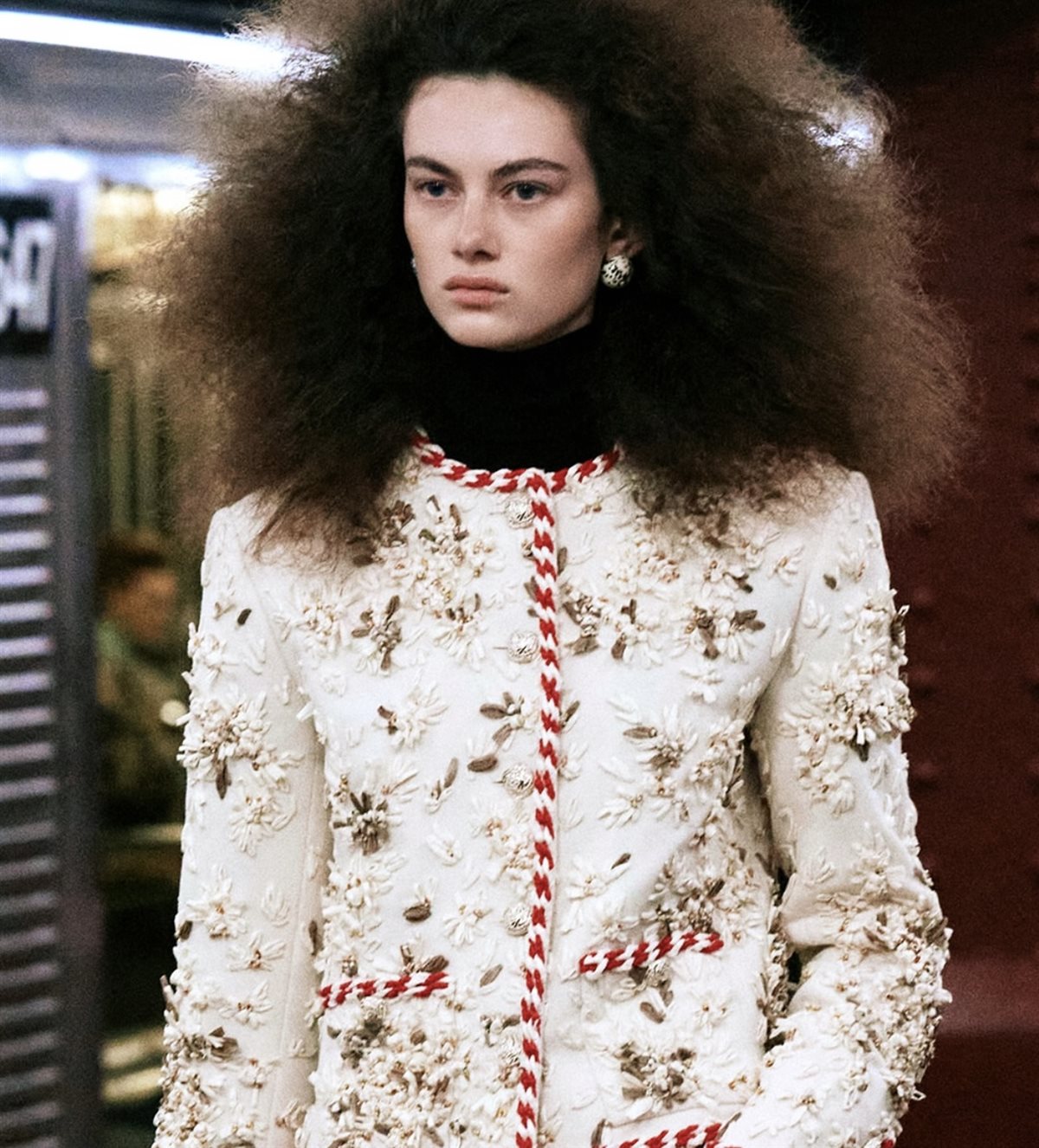 كما ضمت المجموعة بدلة شانيل الشهيرة مطرّزة يدويًا بتقنية “بوب كورن”، وهي تقنية تضيف طبقات ناعمة وحبيبات بارزة تعكس الضوء لتمنح البدلة حضورًا مُفعمًا بالحركة والمرح. وتأتي هذه اللمسة لتذكّر بهوية شانيل التي لطالما احتفت بالتطريز اليدوي وما يحمله من رمزية للفخامة الباريسية الكلاسيكية.