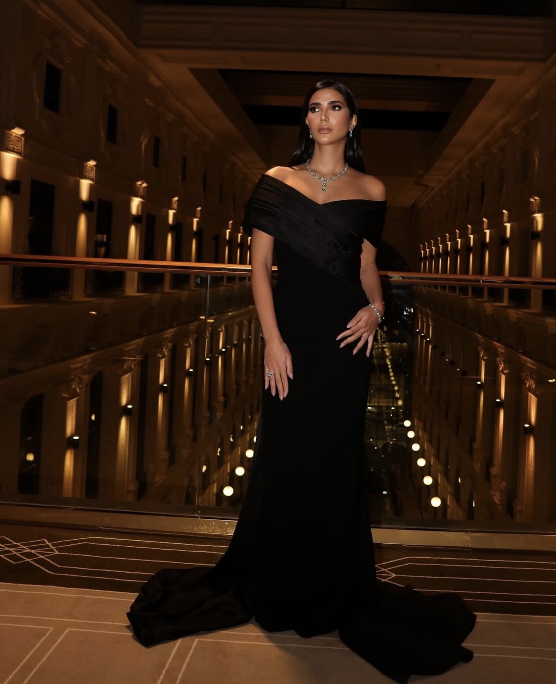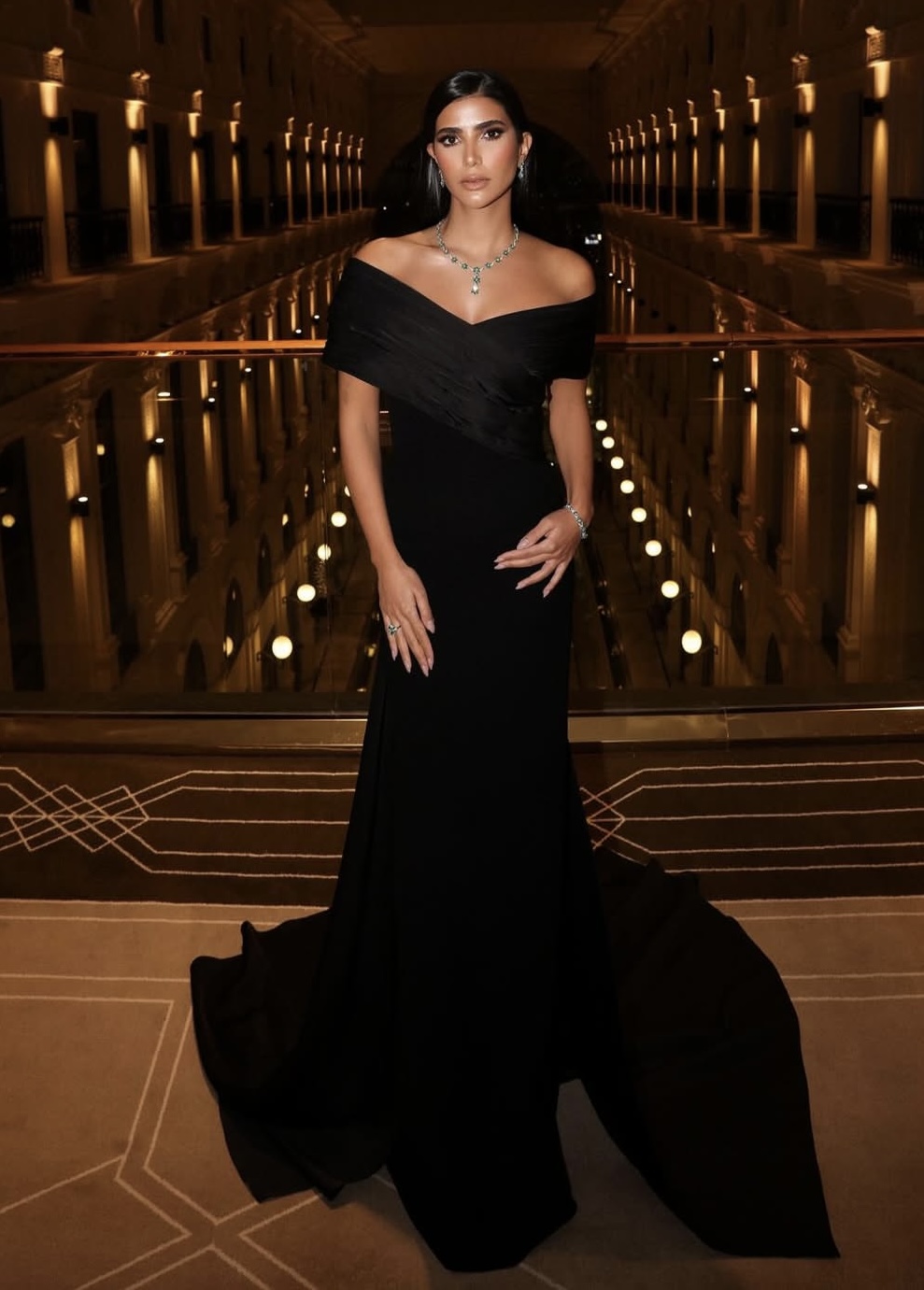 ظهرت ريم سامي بفستان أسود طويل من توقيع المصمم رامي قاضي، جاء بتصميم أنثوي راقٍ يعكس فلسفة البساطة الفاخرة. الفستان تمتع بقصّة انسيابية منسدلة مع ذيل ممتد يمنح الإطلالة بعدًا ملكيًا، فيما تميز الجزء العلوي بقماش مطوي بطريقة هندسية أنيقة تنسدل بنعومة على منطقة الأكتاف، كاشفة عن ياقة أوف شولدر تزيد من جاذبية المظهر وتبرز جمال العنق والكتفين. اللون الأسود الكلاسيكي بدا خيارًا مثاليًا لهذه الأمسية الاحتفالية، إذ يجسّد القوة والوقار مع لمسة رومانسية راقية.