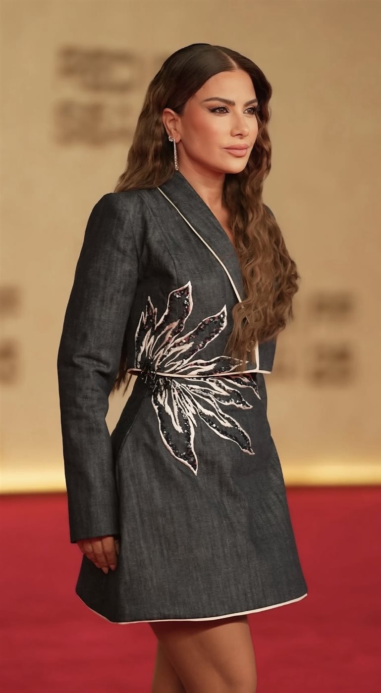 اختارت صبا فستانًا بتصميم يُحاكي أسلوب البدلة الرسمية لكن بلمسة عصرية مبتكرة، حيث جاء مصنوعًا من قماش يشبه الدنيم الداكن، ما أضفى على الإطلالة طابعًا حداثيًا غير تقليدي. تميّز الفستان بقصّة مستقيمة قصيرة تُظهر رشاقتها، مع ياقة حادة تمنح الحضور لمسة من القوة والثقة. أما أجمل ما في الإطلالة فهو التطريز الفني البارز على جانب الفستان، الذي جاء على هيئة أوراق نباتية منمّقة بخيوط لامعة تجمع بين الفضي والأسود، مقدمًا عنصرًا بصريًا لافتًا يضيف الحركة والبعد الفني إلى التصميم.