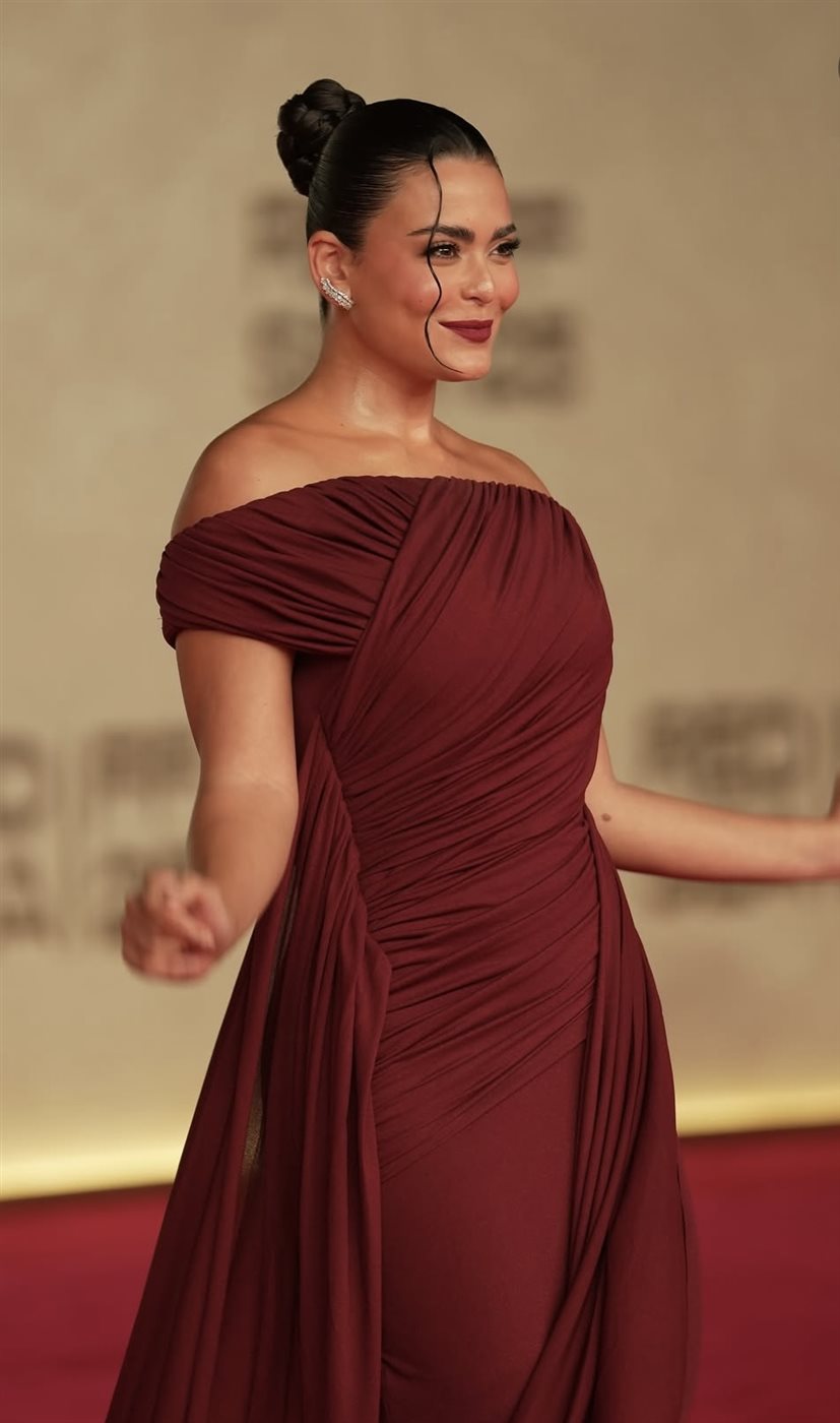 ارتدت أسماء جلال فستاناً فاخراً باللون الخمري العميق، بدرجة دافئة تليق بلون بشرتها وتبرز ملامحها بشكل آسر. الفستان جاء بتصميم الأوف شولدر الذي كشف عن الكتفين بأناقة، مع دريبينج (كشكشة ناعمة) تغطي كامل الجزء العلوي وتنساب بانسيابية على القوام، ما أضفى على الإطلالة طابعاً ملكياً ناعماً.