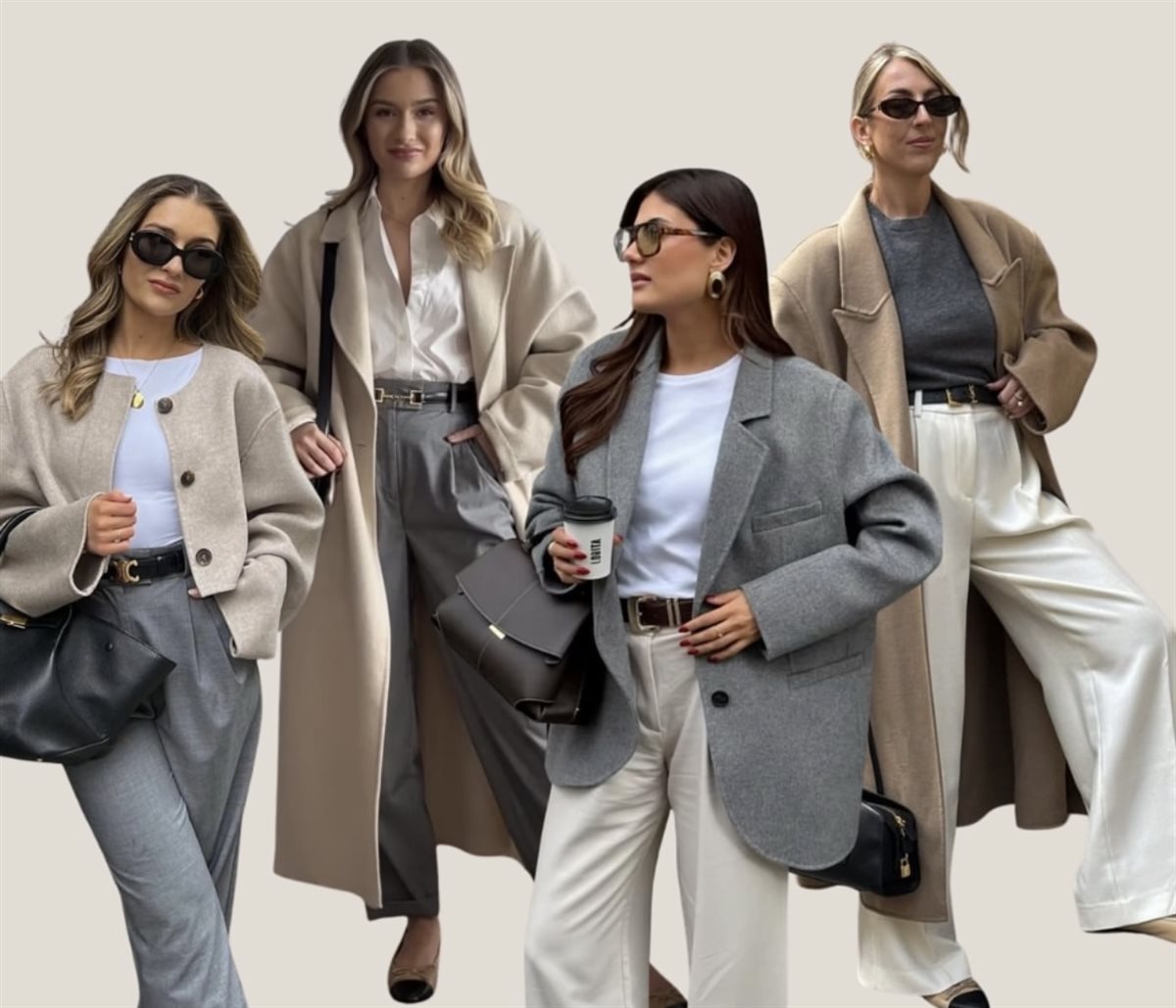 تجمع هذه التركيبة بين الدرجات الحيادية الترابية، مع لمسة رمادية داكنة تزيد من أناقة القطع. تراها بوضوح في الإطلالات التي تجمع معاطف واسعة مع سراويل فاتحة، ما يعطي مظهراً دافئاً مرتّباً يناسب مختلف المناسبات.