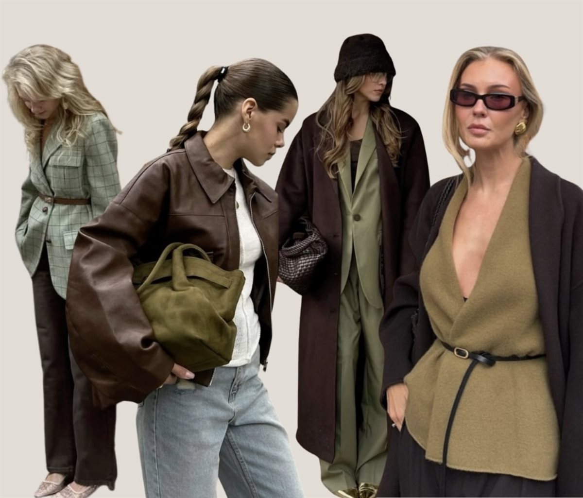ويبرز تنسيق الأخضر الزيتي والكاكي مع درجات البني الداكن والإسبريسو، في معاطف جلدية أو بدلات واسعة. يمنح هذا الثنائي مظهراً قوياً وعملياً يناسب عاشقات الأسلوب الجريء.
