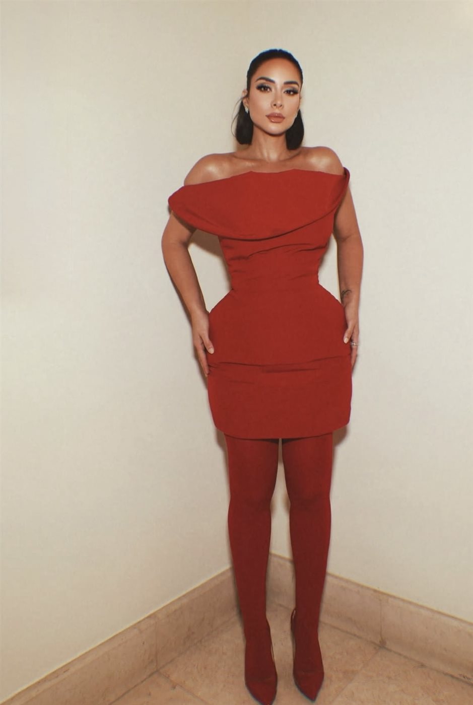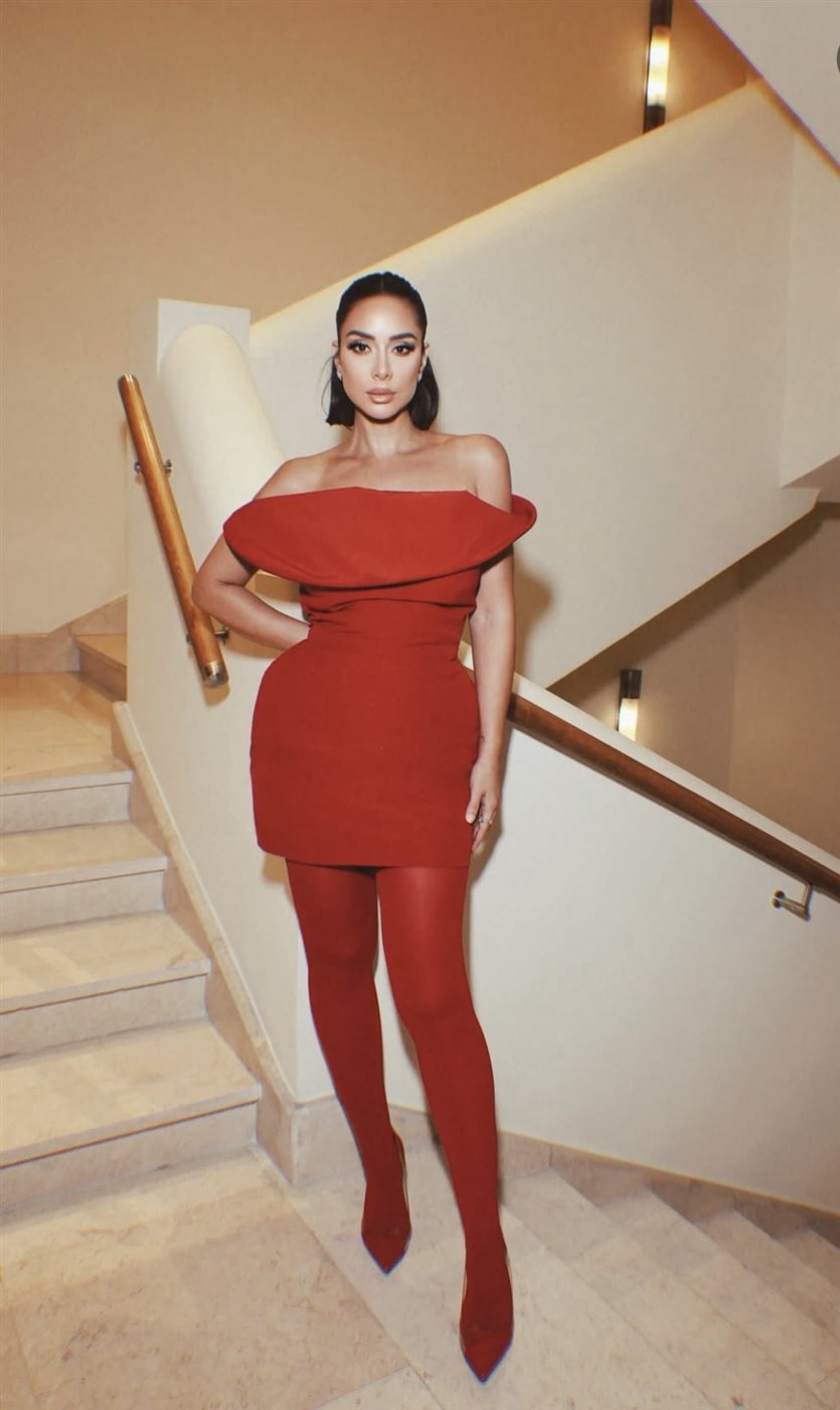 ظهرت بسنت بفستان بتوقيع Magda Butrym، تميّز بقصّة مجسّمة تبرز الخصر وتحدد القوام بدقة، مع تصميم مبتكر عند منطقة الصدر جاء على شكل طيّات عريضة منسدلة تمنح الإطلالة بُعدًا معاصرًا. اختيار الفستان القصير نسبياً ترافق مع بوت ضيق بلون مطابق يمنح الإطلالة امتدادًا بصريًا جذابًا، ويخلق مظهر الـ monochrome الذي يجمع بين الفخامة والقوة في الوقت ذاته.