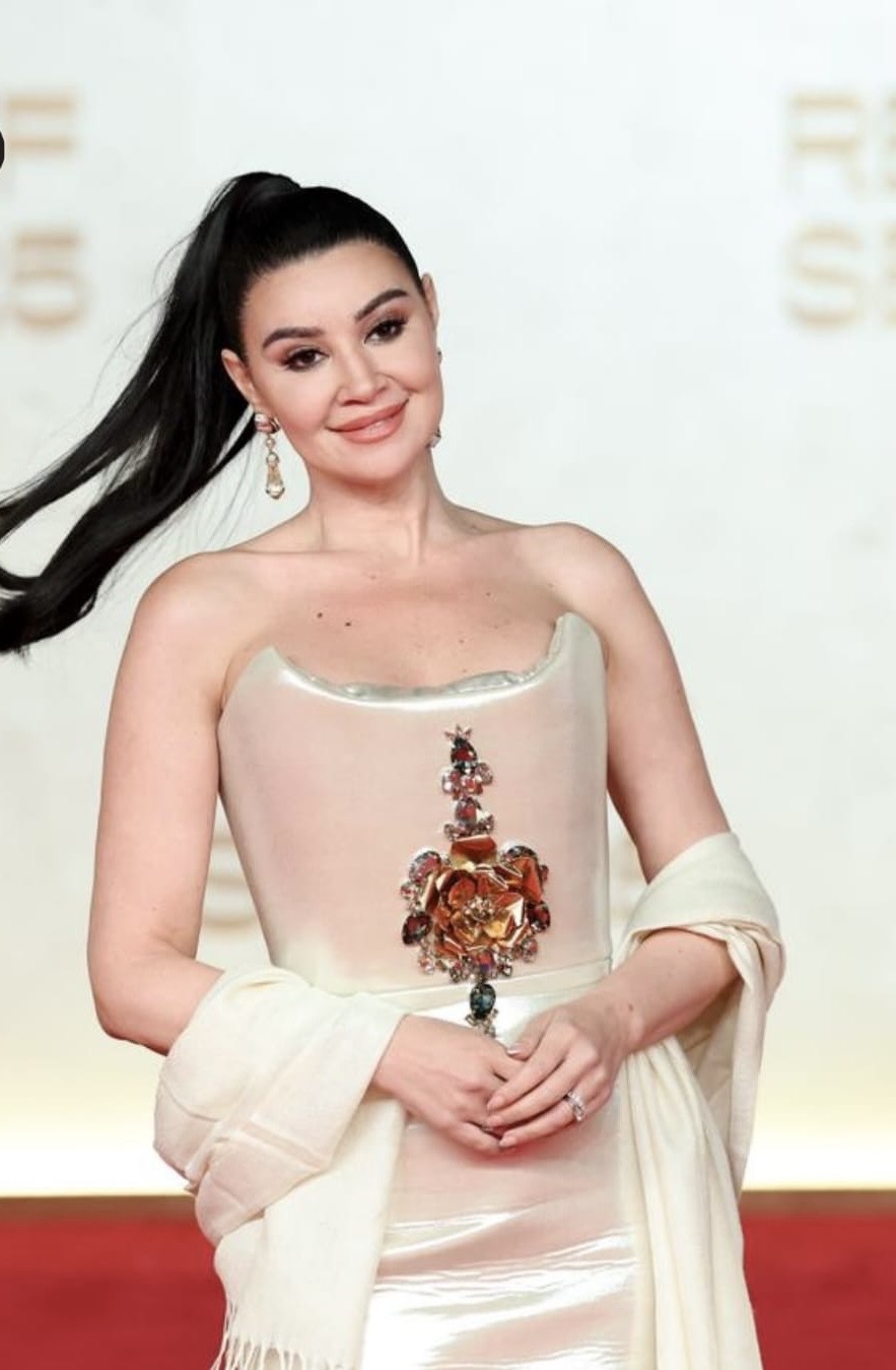 الجزء العلوي من الفستان هو أكثر ما لفت الأنظار، فقد جاء بتصميم سترابليس بسيط لكنه أنيق، مع حافة علوية منحنية تمنح منطقة الصدر شكلاً راقياً ومتوازنًا. أما التفصيلة الأبرز، فكانت الوردة المعدنية البارزة المزينة بأحجار ملونة تتوسط منطقة الخصر والصدر. هذه الوردة بتصميمها النحتي أعطت للفستان شخصية فريدة، وجعلت الإطلالة تحمل طابعاً فنياً دقيقاً وملفتاً، وكأنها قطعة مجوهرات مدمجة داخل الفستان نفسه.