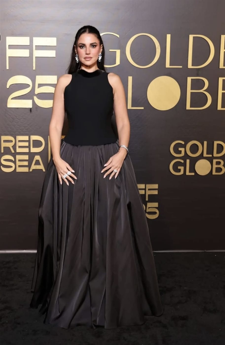 اختارت درة فستانًا أسود راقيًا بقصة عصرية مكونة من جزأين متناغمين؛ الجزء العلوي جاء ضيقًا بتصميم بدون أكمام وبياقة مستديرة عالية مما أبرز كتفيها ومنح الإطلالة طابعًا شبابيًا وقويًا في الوقت نفسه. أما الجزء السفلي فجاء بتنورة واسعة من قماش لامع فاخر بتدرجات الرمادي الداكن، مزينة بطيات متعددة تضيف حركة ورقيًا إلى الإطلالة. هذا التباين المدروس بين خامتي الجزء العلوي والسفلي منح الفستان أناقة معمارية جذابة تُظهر حنكة المصمم وخبرة منسّق الإطلالة.