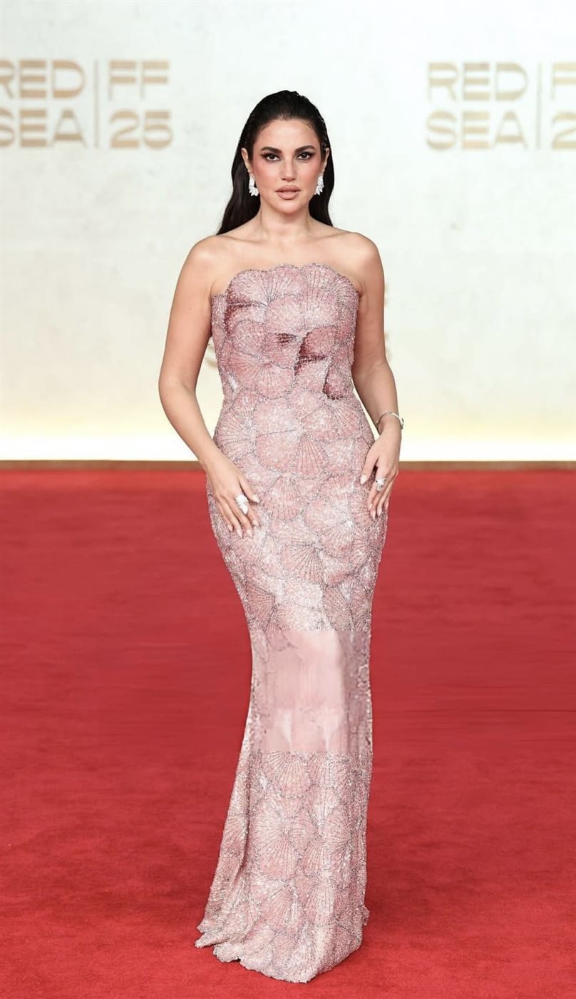 ظهرت درة بفستان وردي فاتح strapless بقصة عمودية راقية تحتضن القوام بانسيابية، وتبرز جماله دون تكلف. الفستان مرصّع بالكامل بتطريزات دقيقة تشبه القواقع أو الزهور المتداخلة، في تصميم هندسي فاخر يمنح الإطلالة بُعدًا فنيًا مميزًا. اللعب على درجات الوردي اللامع والمتداخل مع الفضي أعطى الفستان بريقًا خاصًا تحت إضاءة السجادة الحمراء، ما جعل درة تبدو كأيكونة تتلألأ بين الحضور.