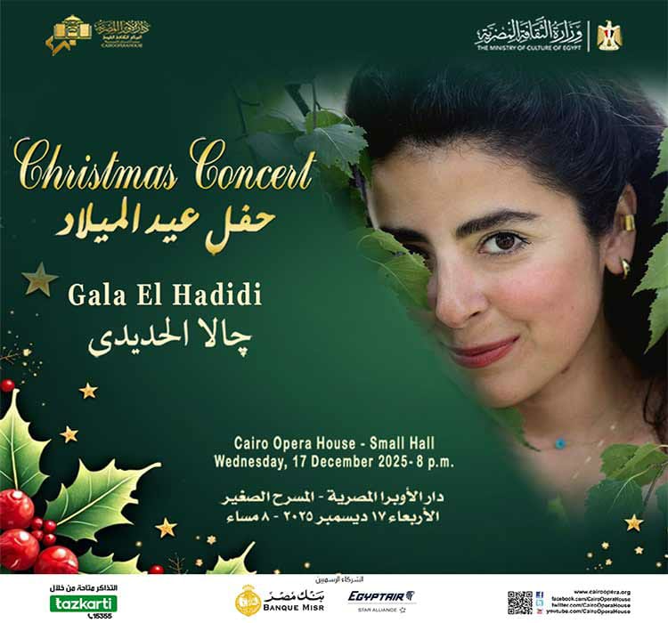 تواصل دار الأوبرا المصرية برئاسة الدكتور علاء عبد السلام احتفالاتها بأعياد الكريسماس والعام الجديد، حيث تقيم أمسية غنائية مميزة للمغنية الميتزوسوبرانو جالا الحديدى بمصاحبة عازف البيانو جريج مارتن، وذلك في تمام الساعة الثامنة مساءً يوم الأربعاء 17 ديسمبر على المسرح الصغير.