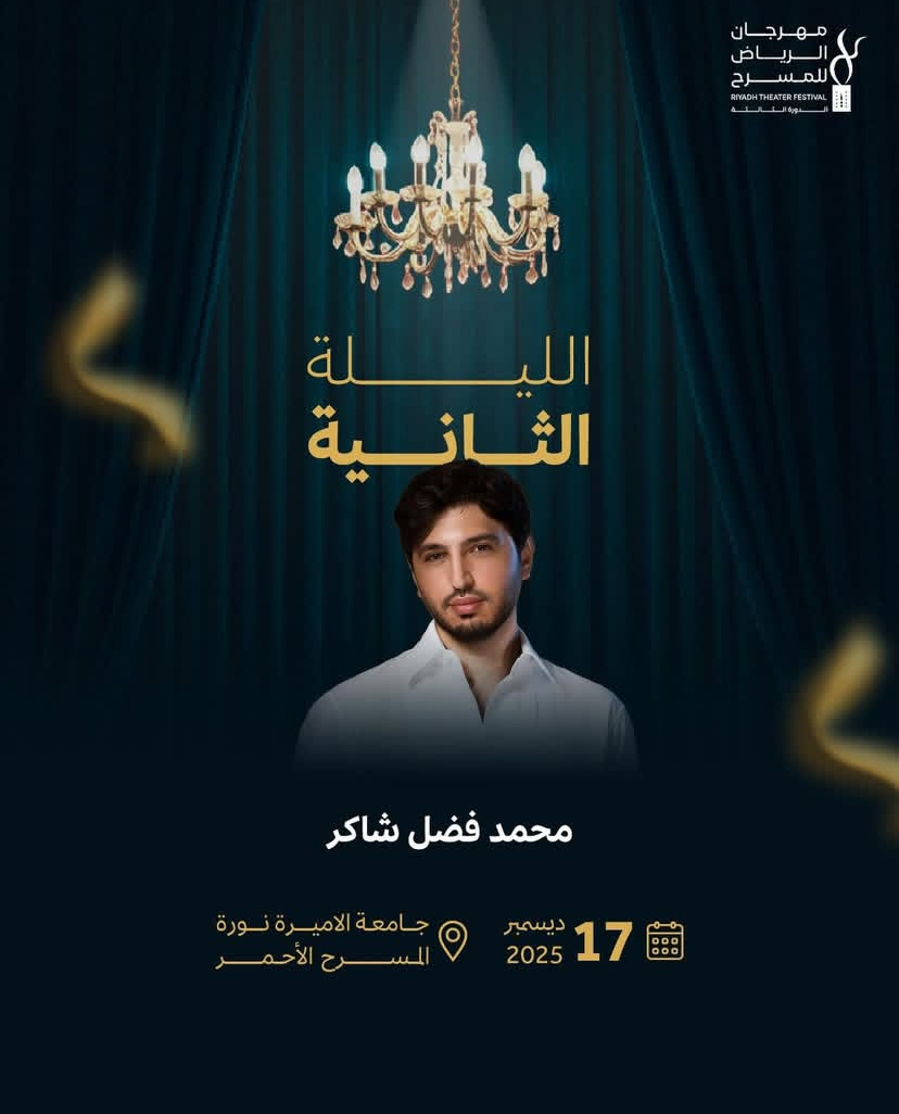 كما كشف الحساب عن الحفل الثاني الذي يحييه الفنان محمد شاكر يوم 17 ديسمبر وكتب:"ليلة مميزة ضمن مهرجان الرياض للمسرح موعدكم مع الإحساس وصوت لامس القلوب الفنان محمد شاكر يحيي ليلة غنائية استثنائية لا تعوض".