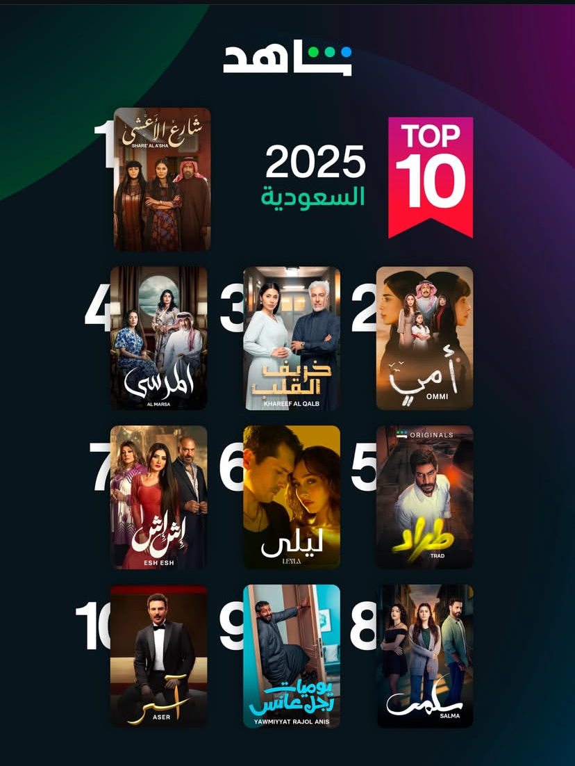 كشفت منصة “شاهد” عن قائمة الأعمال الدرامية المفضلة لدى الجمهور السعودي خلال عام 2025 حيث تصدر مسلسل “شارع الأعشى” القائمة بعد النجاح اللافت الذي حققه خلال الموسم الرمضاني الماضي في وقت أعلنت فيه المنصة أيضا عن الأعمال الأكثر مشاهدة في مصر وسط منافسة قوية بين الدراما الخليجية والمصرية والأعمال المعربة.