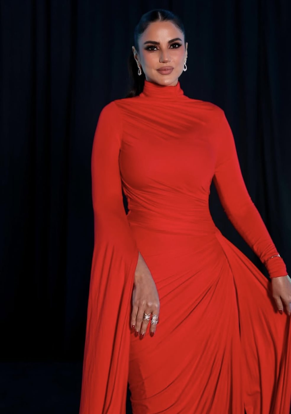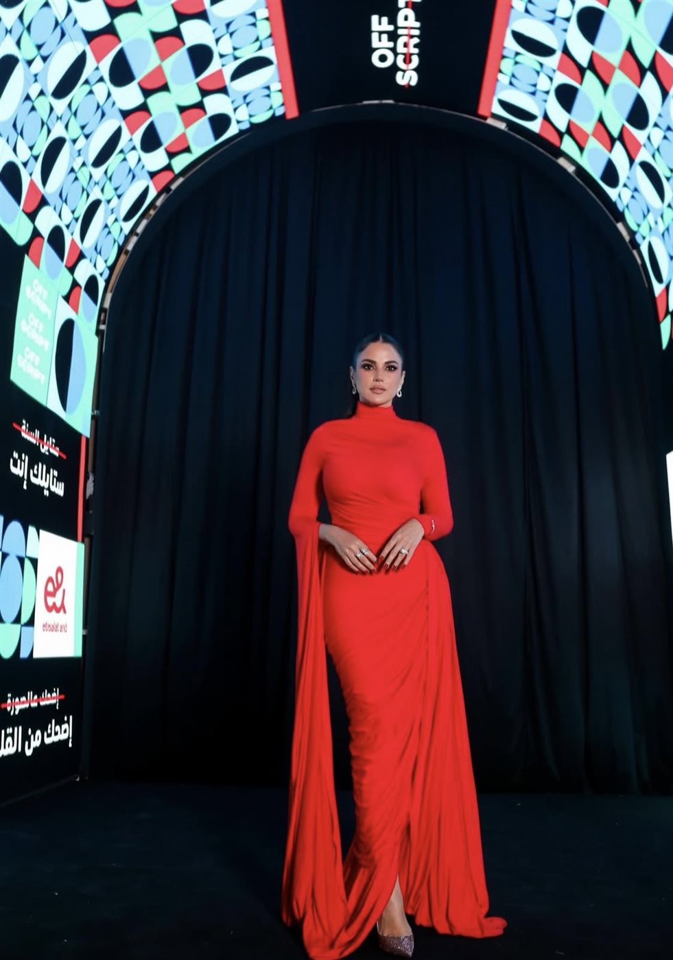 فمنذ اللحظة الأولى لظهورها، بدت درة واثقة الخطى، تحاكي حضورها القوي بإطلالة لونية جريئة اختارت فيها الأحمر القاني، اللون الذي لطالما ارتبط بالقوة والأنوثة معًا. الإطلالة جاءت بتوقيع المصممة سلمي عثمان ، في تصميم يترجم فلسفة الموضة المعاصرة القائمة على إبراز القوام بأسلوب أنيق غير متكلف، مع المحافظة على لمسة درامية تناسب أجواء الحفل ووهجه.