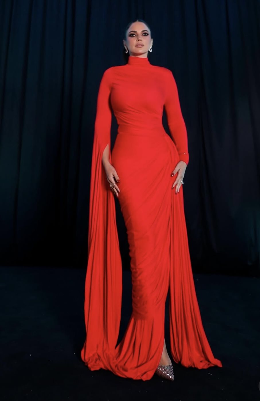 الفستان الأحمر جاء بقصّة طويلة منسدلة، عانق القوام بانسيابية لافتة، مع ياقة عالية أضفت لمسة من الرقي والوقار، في توازن مدروس مع جرأة اللون. أبرز ما ميّز التصميم هو الأكمام الطويلة المتصلة بذيلين جانبيين ينسابان على الأرض، ما منح الإطلالة بعدًا مسرحيًا وحركة أنيقة أثناء المشي، وجعل الفستان قطعة فنية متكاملة لا تحتاج إلى مبالغة في التفاصيل.