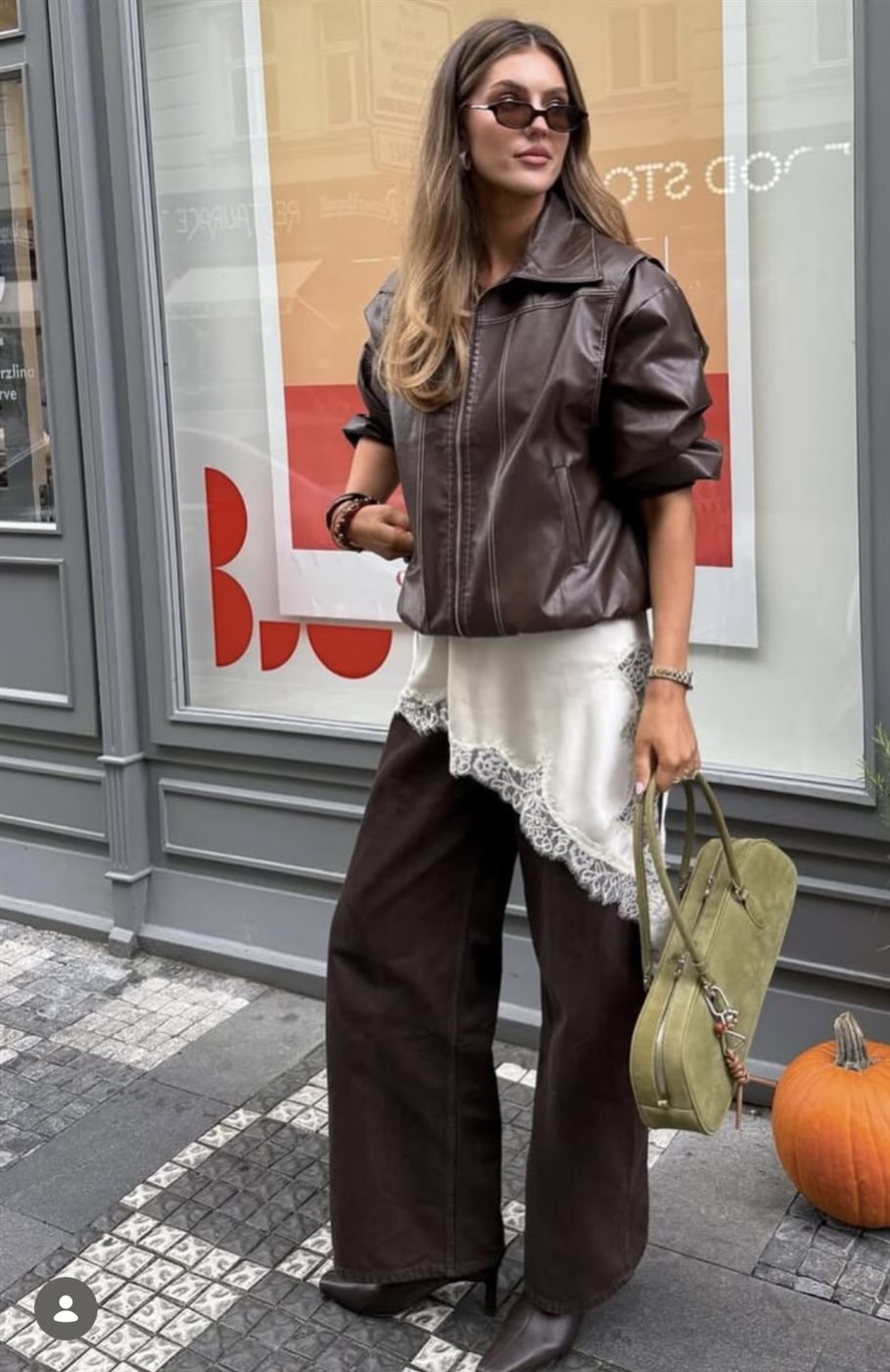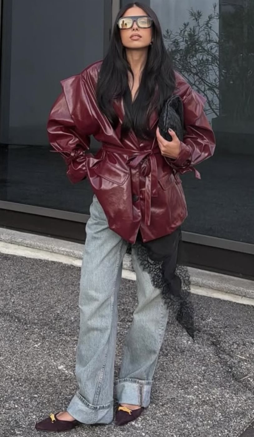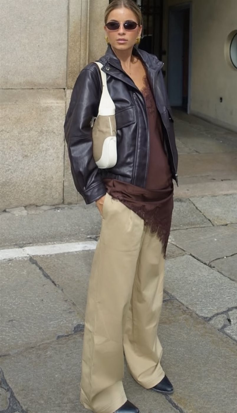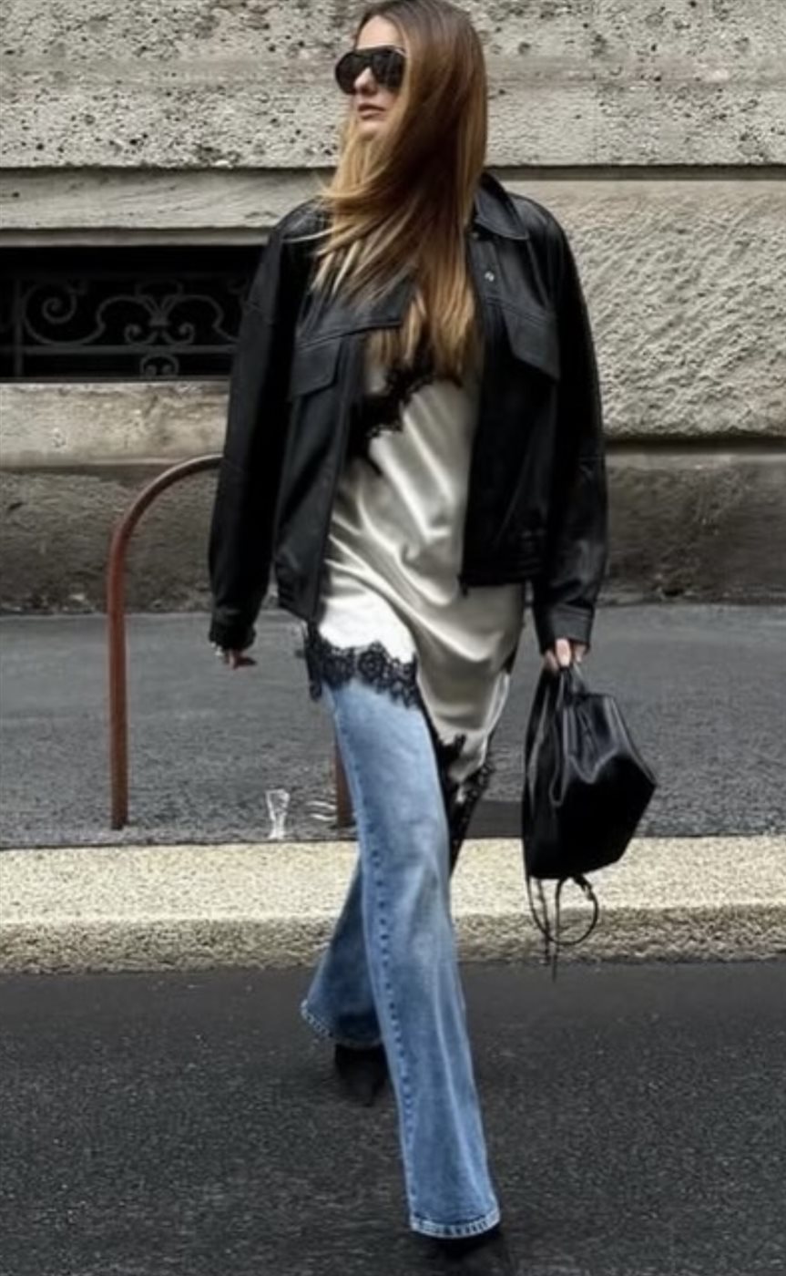 - مع الجاكيت الجلدي: تنسيق الـSlip Dress مع جاكيت جلدي يمنح الإطلالة توازنًا مثاليًا بين النعومة والقوة، وهو خيار مفضل لإطلالات النهار والمساء.