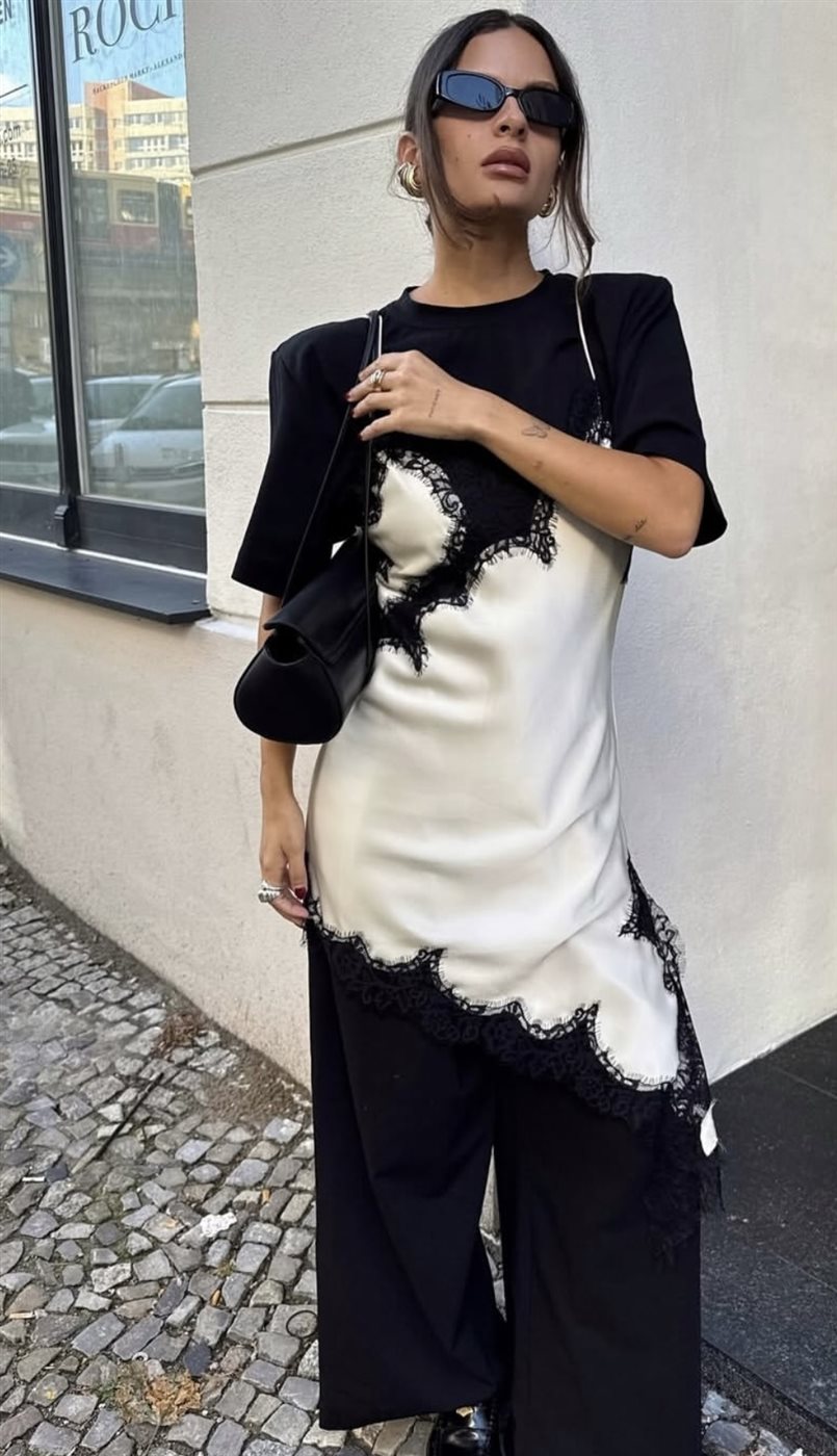 - الطبقات الذكية: يمكن ارتداء كنزة رفيعة أو توب بياقة عالية أسفل الفستان، أو قميص أبيض بسيط لإطلالة عصرية مستوحاة من أسلوب الشارع.
