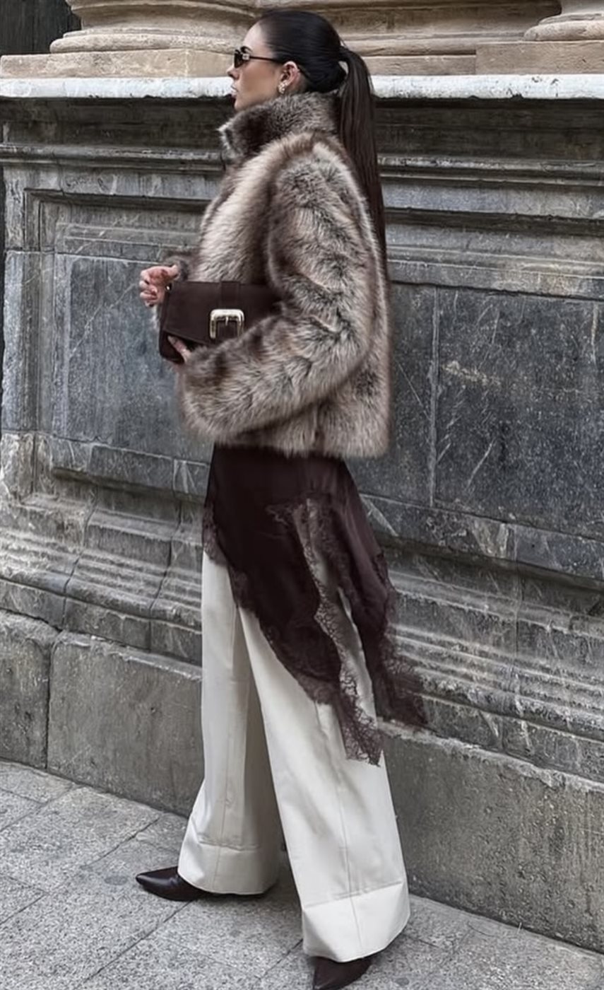 - الإكسسوارات: النظارات الشمسية الكبيرة، الحقائب الجلدية، والأوشحة الصوفية تعزز الطابع الشتوي العصري.