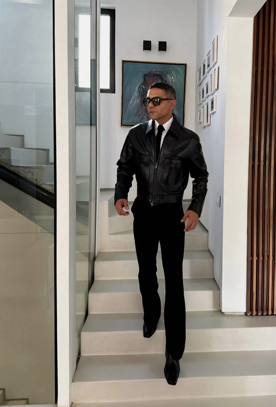 اختار آسر ياسين إطلالة سوداء بالكامل، جمعت بين الكلاسيكية والعصرية في آنٍ واحد. ارتدى جاكيت جلدي أسود بقصّة أنيقة، أضفت على اللوك طابعًا قويًا وذكوريًا، مع لمسة عصرية تناسب أجواء السجادة الحمراء. وجاء الجاكيت منسقًا مع بنطال أسود مستقيم بقصّة مريحة، منح الإطلالة توازنًا واضحًا وأناقة هادئة.