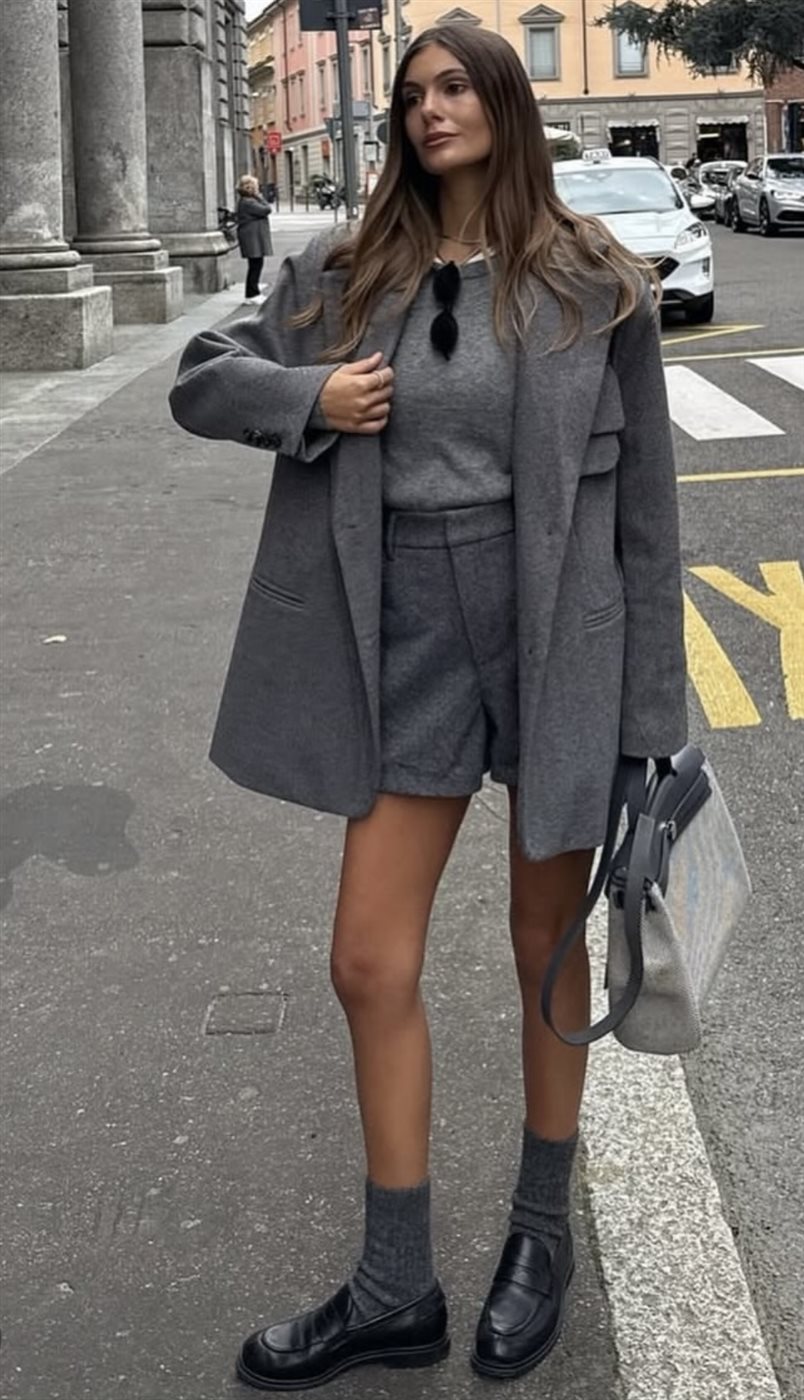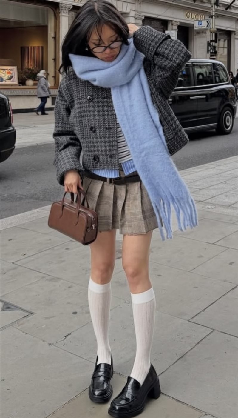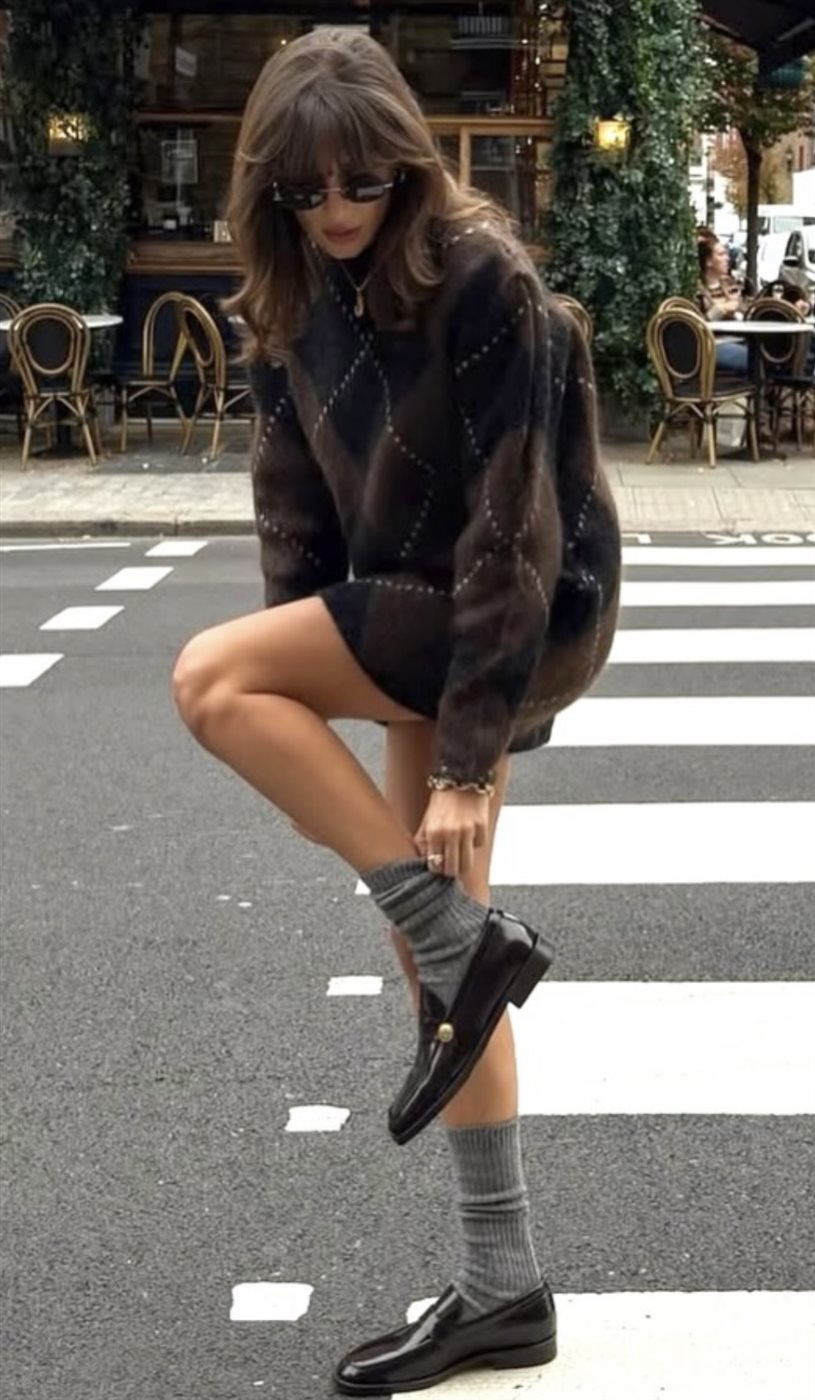 - إطلالة الـPreppy العصرية: تنسيق اللوفرز مع جوارب عالية نسبيًا، مع تنورة قصيرة أو ميدي وبليزر أو كارديغان، يمنحك مظهرًا مستوحى من الأزياء الجامعية الراقية.