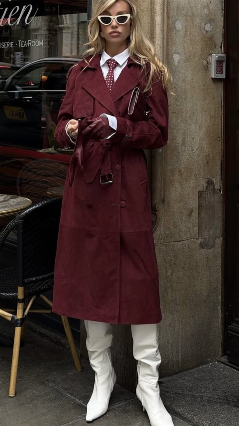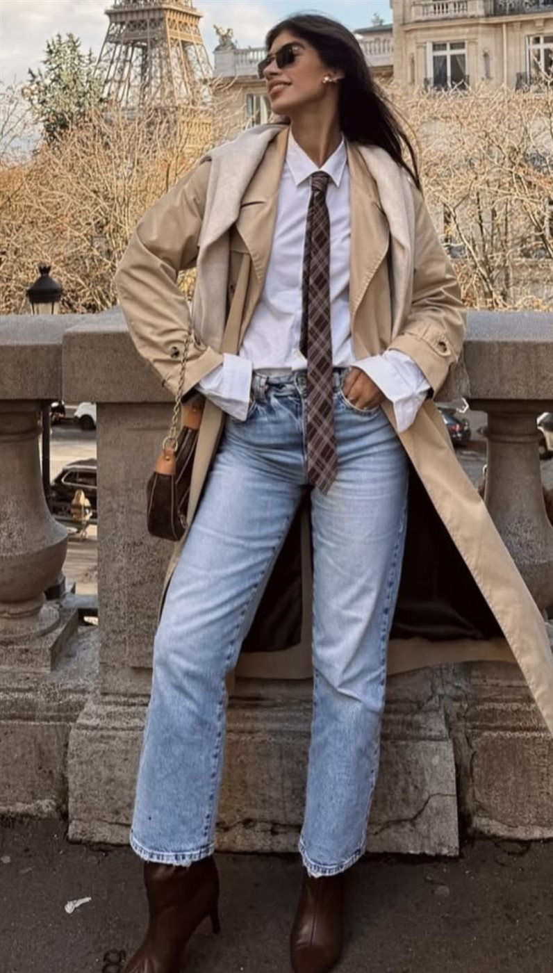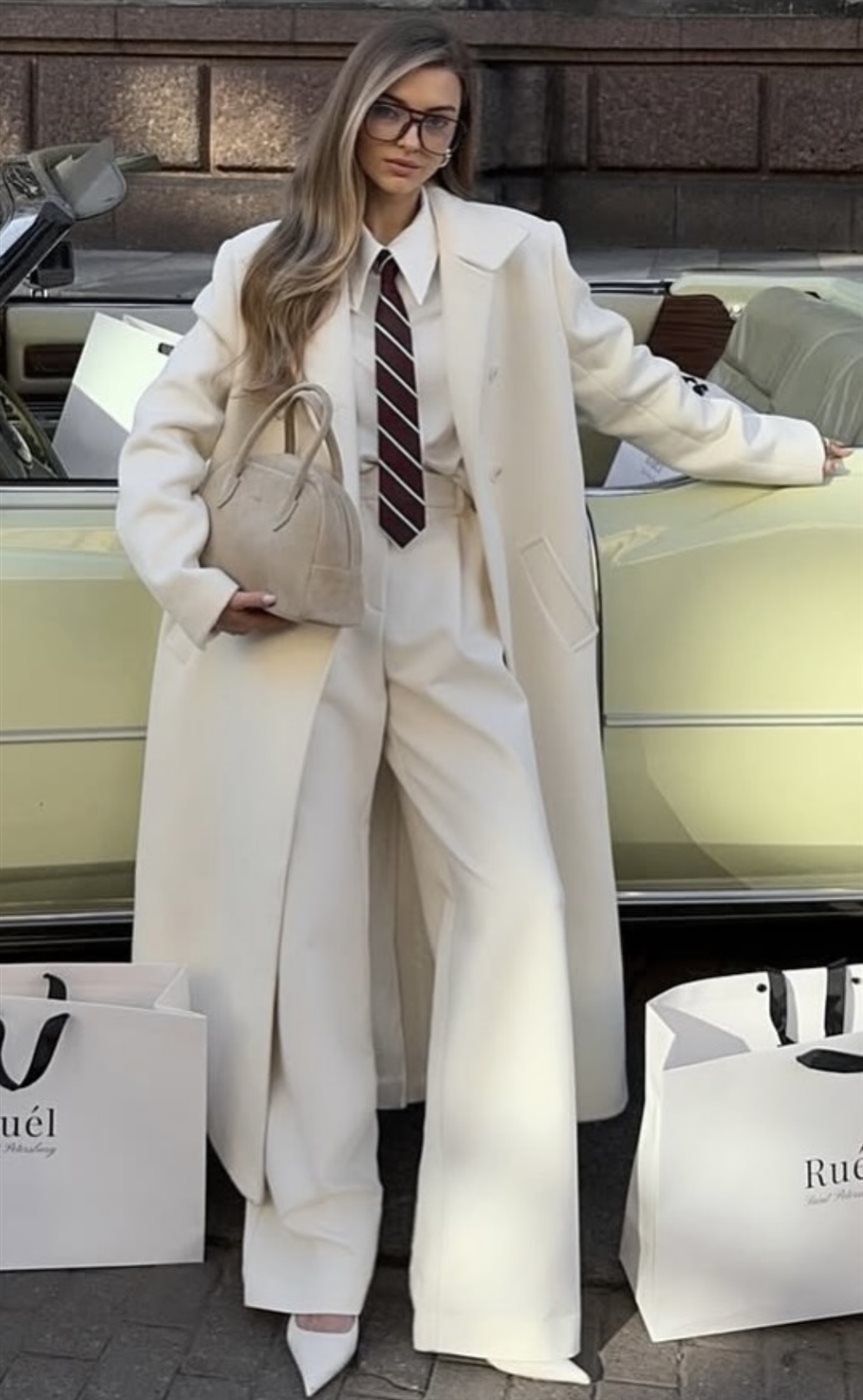 - الإطلالة الكلاسيكية العصرية: يمكن تنسيق ربطة العنق مع قميص أبيض وبليزر وبنطال واسع، لإطلالة مستوحاة من الأزياء الرجالية لكن بلمسة أنثوية أنيقة تناسب العمل والمناسبات الرسمية.