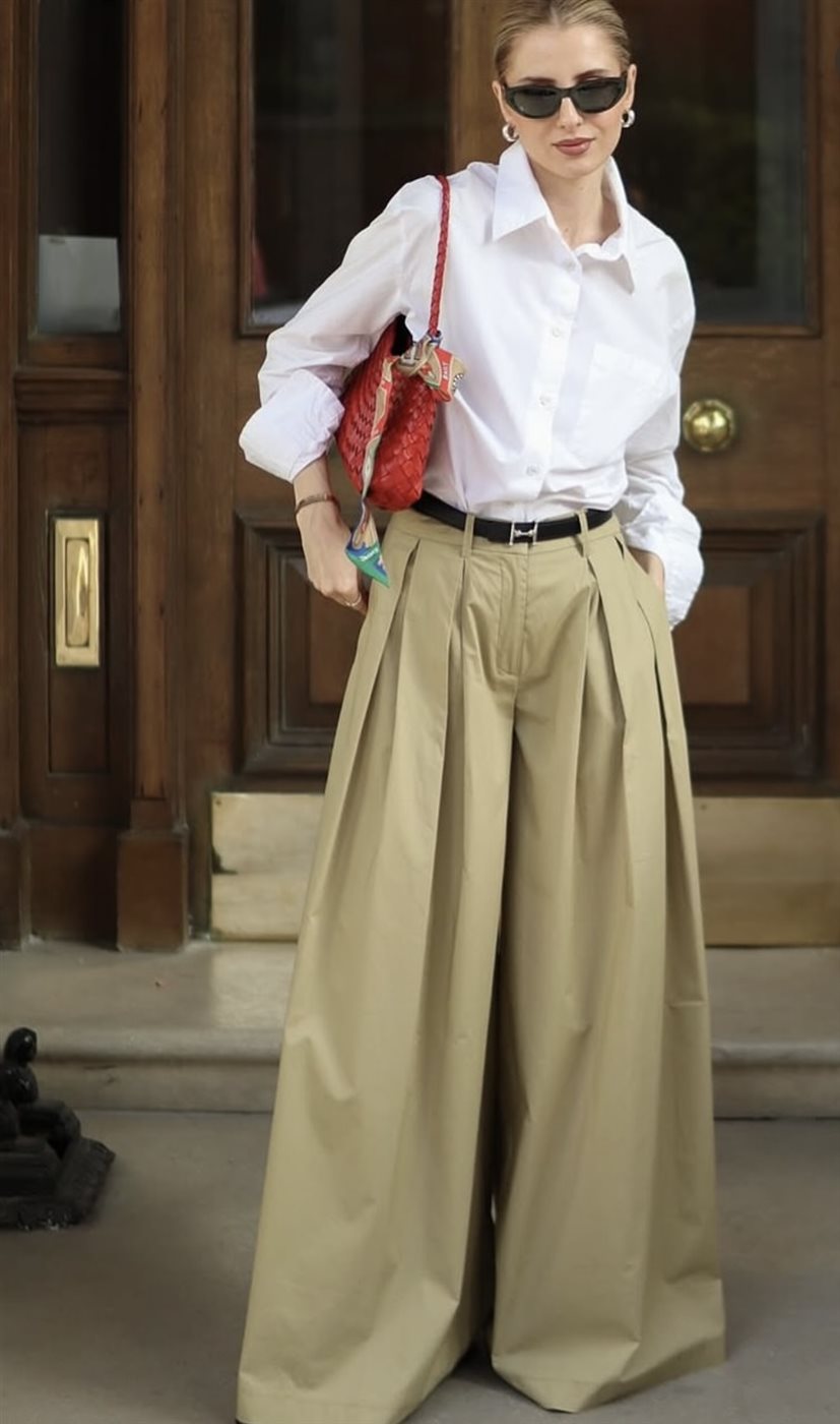 - لإطلالة عمل أنيقة: بنطال واسع عالي الخصر + قميص أبيض + بليزر، مع حذاء بكعب متوسط أو لوفر “فاخر المظهر”.