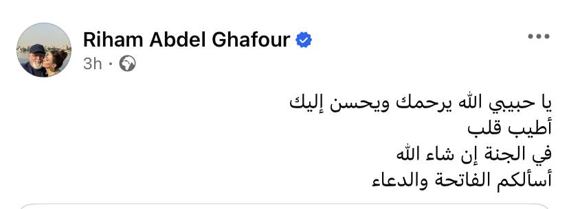 حرصت الفنانة ريهام عبد الغفور على نعي الراحل عبر حسابها الرسمي على موقع “فيس بوك” وكتبت:"يا حبيبي الله يرحمك ويحسن إليك.. أطيب قلب في الجنة إن شاء الله أسألكم الفاتحة والدعاء".
