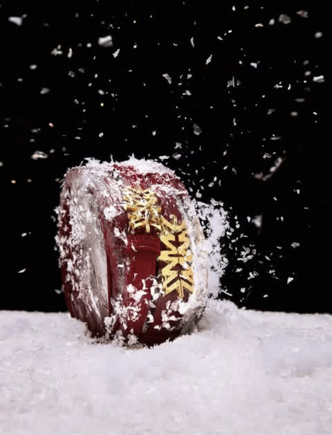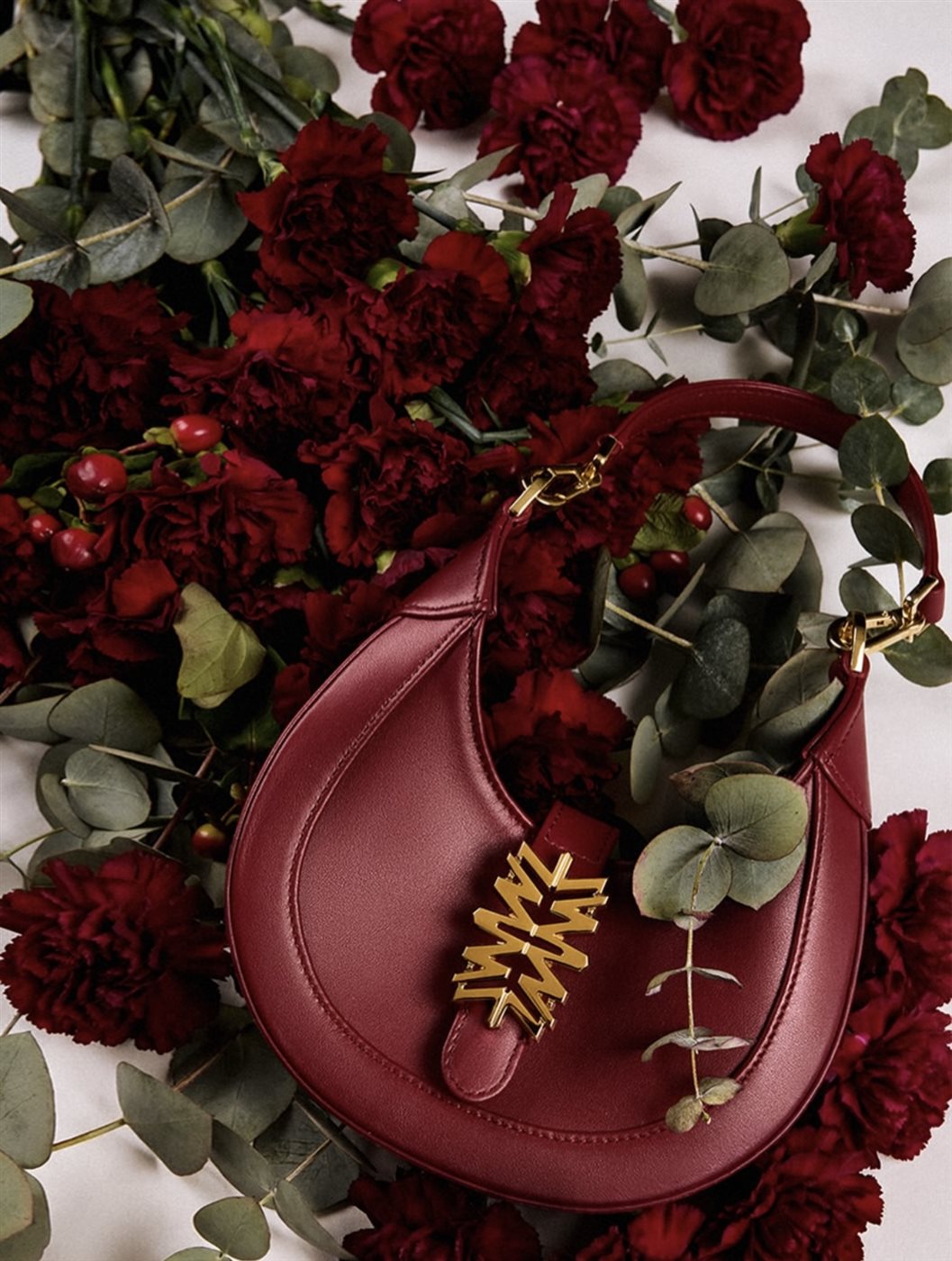 تتصدّر الألوان الغنية المشهد، وعلى رأسها الأحمر العميق بدرجاته المخملية، الذي يرمز إلى الدفء والفخامة والاحتفال. تظهر الحقائب الجلدية المنحنية بتصميم أنثوي ناعم، تتوسطها علامة الدار الذهبية الأيقونية المصاغة بأسلوب نحتي لافت، ما يضفي لمسة فنية معاصرة على القطع. في الصور، تتجاور الحقائب مع الورود الحمراء وأغصان الأوكالبتوس، في مشهد بصري يعكس التناقض المدروس بين القوة والرقة، وبين الطبيعة والفخامة.