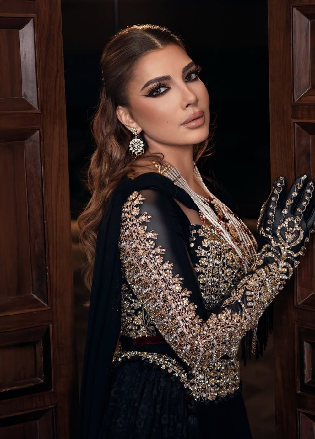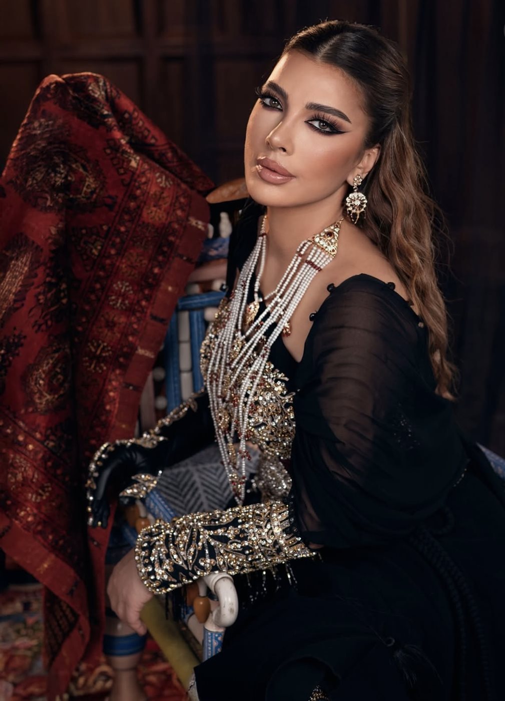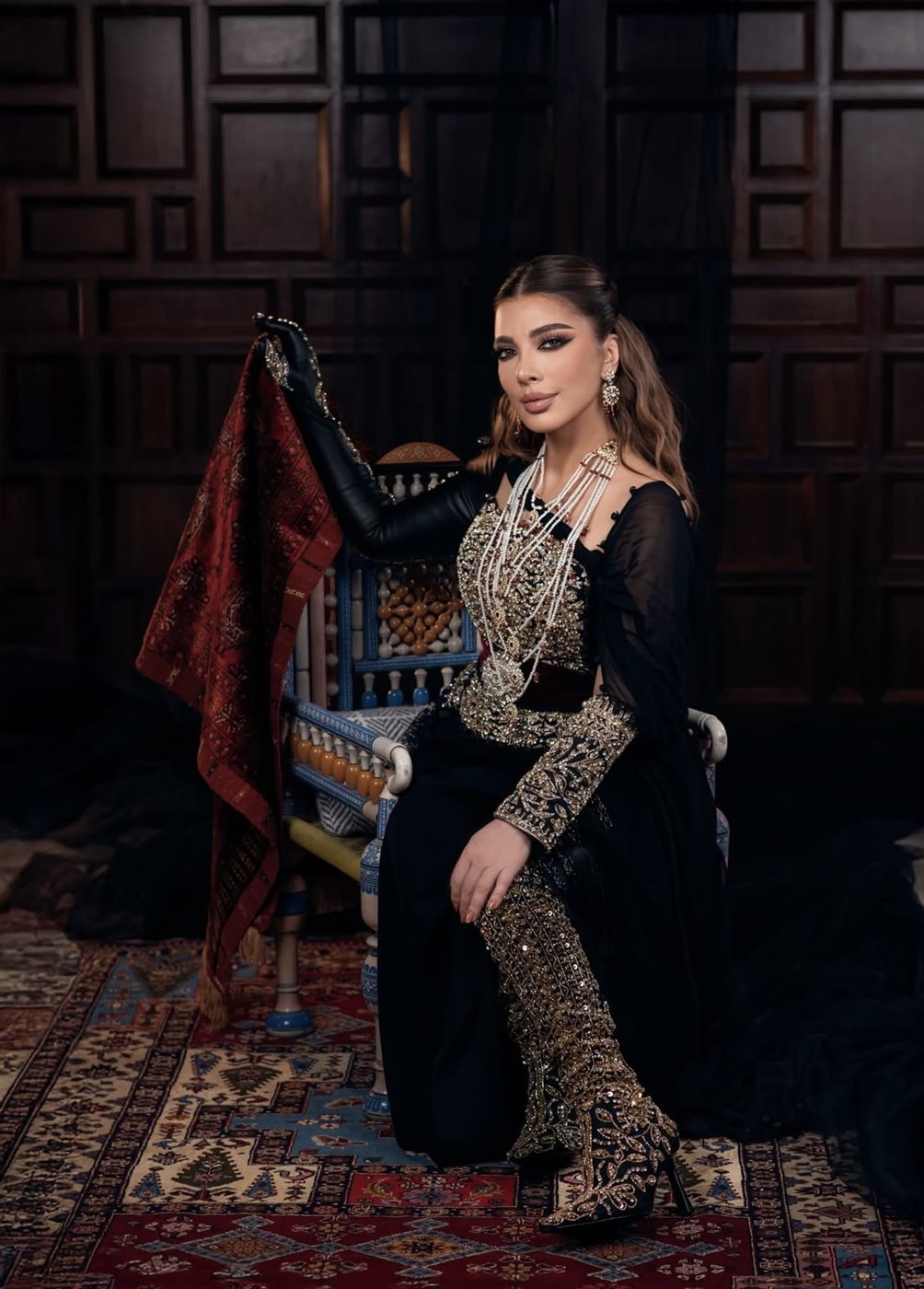ظهرت أصالة بإطلالة يغلب عليها اللون الأسود، اختير بعناية ليكون قاعدة أنيقة تُبرز غنى التفاصيل والزخارف الذهبية التي زيّنت التصميم وجاء التصميم بتوقيع الدار الكويتية المميزة مهرة . التطريزات الكثيفة والدقيقة امتدت على الصدر والأكمام وحتى القفازات الطويلة، ما منح الإطلالة طابعًا ملكيًا مهيبًا يذكّر بالأزياء التراثية الفاخرة. وجاء القماش الشفاف في بعض الأجزاء ليضيف لمسة أنثوية ناعمة، توازن بين الجرأة والرقي دون إخلال بهيبة التصميم.