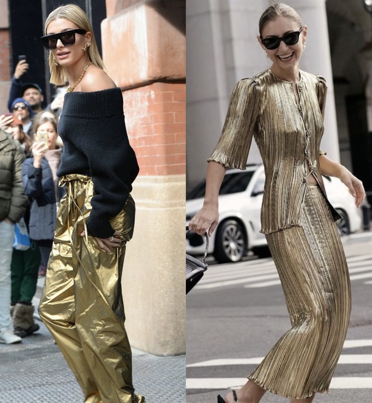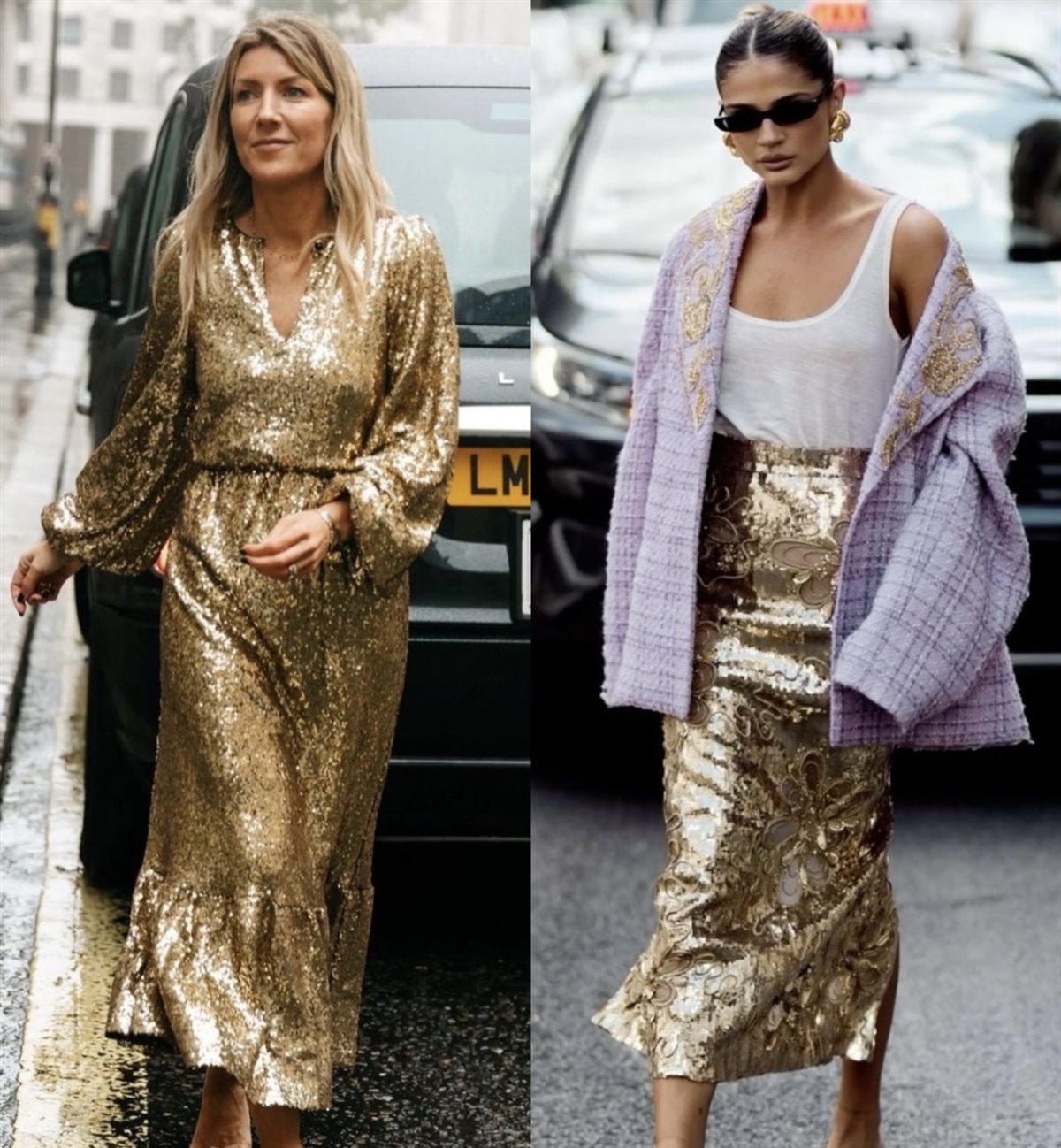 هذا الموسم، نلاحظ تنوّعًا لافتًا في توظيف اللون الذهبي؛ من الفساتين المرصّعة بالترتر اللامع التي تخطف الأنظار في السهرات المسائية، إلى الإطلالات اليومية التي تكتفي بلمسة ذهبية ناعمة عبر الإكسسوارات أو الأحذية المعدنية. الفساتين الذهبية الطويلة أو القصيرة تظلّ الخيار الأبرز لحفلات عيد الميلاد، خاصة تلك المصنوعة من الأقمشة اللامعة مثل الساتان، أو المزدانة بالتطريزات الدقيقة التي تعكس الضوء بطريقة أنيقة دون مبالغة.