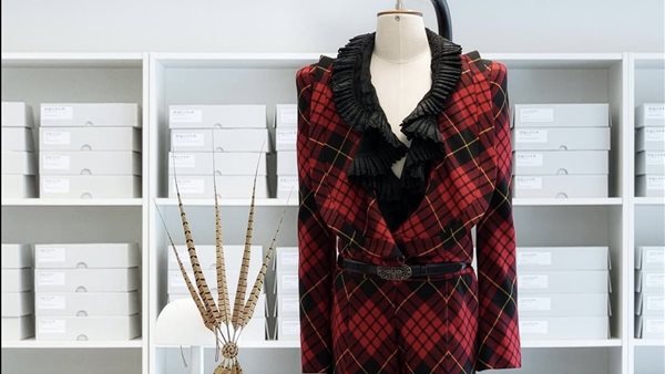 وتأتي الإطلالة رقم 28 كأحد أبرز تجسيدات هذه الرؤية، حيث يظهر الجمبسوت المفصّل بياقة الشال كقطعة معمارية دقيقة، تعكس براعة ماكوين في فنّ الخياطة الراقية. اختيار قماش صوف الترتان بنقشة “MacQueen” لم يكن تفصيلًا عابرًا، بل إشارة واضحة إلى الجذور الاسكتلندية، وإلى الهوية التي لطالما شكّلت جزءًا أساسيًا من عالم المصمم الراحل. القصّة المحكمة للجمبسوت تبرز القوام بقوة وأناقة، فيما تضيف الياقة لمسة درامية تعزّز الطابع المسرحي للتصميم.
