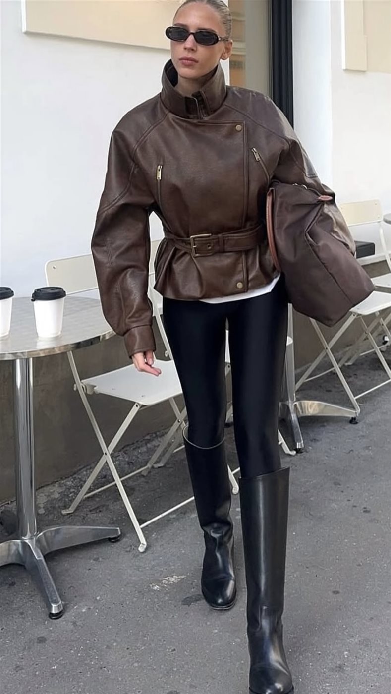 طرق تنسيق الجاكيت الجلدي البني متعددة وتناسب مختلف الأذواق. في الإطلالات اليومية، يمكن تنسيقها مع جينز أزرق أو أسود وتيشيرت أبيض بسيط، مع حذاء مسطح أو بوت جلدي، للحصول على مظهر عملي وأنيق في آن واحد. أما لإطلالة أكثر أنوثة، فيمكن ارتداؤها فوق فستان ناعم أو تنورة ميدي مع حذاء بكعب متوسط، ما يخلق توازنًا جذابًا بين القوة والنعومة. وفي أجواء العمل، يبرز الجاكيت الجلدي البني كخيار ذكي عند تنسيقه مع بنطلون قماشي وقميص كلاسيكي، لتمنح الإطلالة لمسة عصرية دون التخلي عن الرسمية.