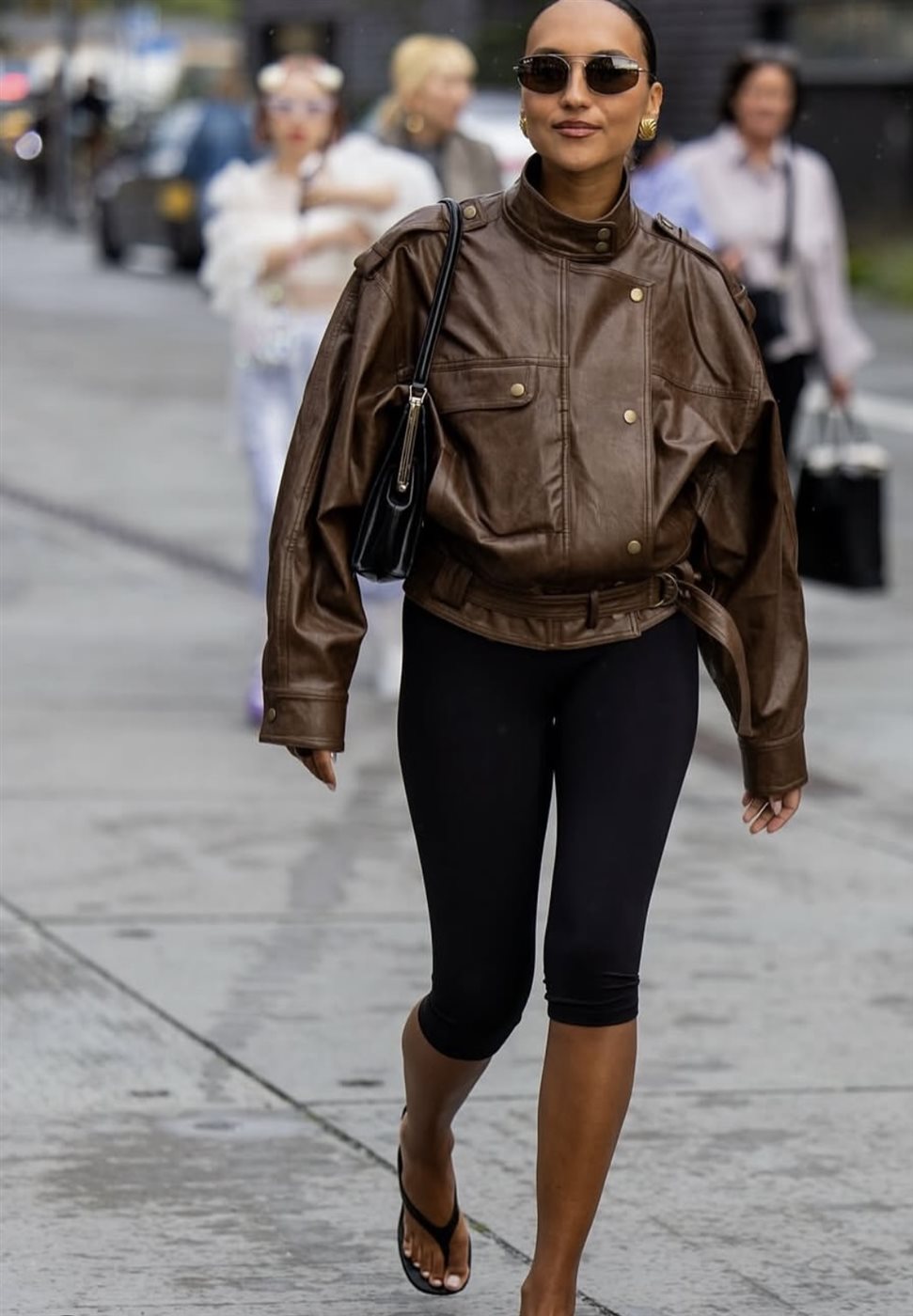 لم تغب هذه القطعة عن إطلالات النجمات، بل كانت خيارًا مفضّلًا لعدد من أيقونات الموضة. تألقت بها هيلي بيبر في إطلالات كاجوال أنيقة، حيث نسّقتها مع الجينز والقمصان البسيطة بأسلوب يعكس بساطتها العصرية. كما اعتمدتها بيلا حديد في إطلالات مستوحاة من أزياء التسعينيات، مع بنطلونات واسعة ونظارات شمسية جريئة. أما ريهانا ، فاختارت السترة الجلدية البنية بأسلوب أكثر جرأة، منسّقة إياها مع قطع لافتة تعكس شخصيتها القوية والمتمرّدة. كذلك ظهرت كيندال جينير بهذه القطعة في إطلالات تجمع بين البساطة والفخامة، مؤكدة أنها عنصر أساسي في خزانة المرأة العصرية.