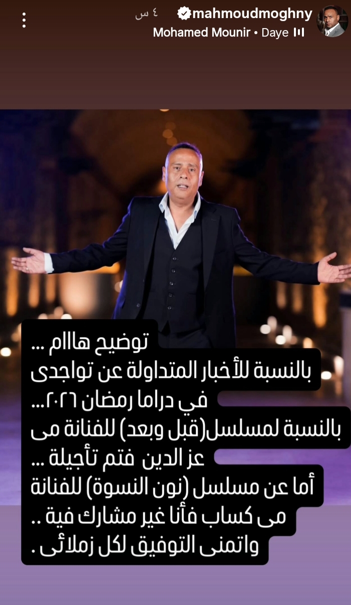 «توضيح هام بالنسبة للأخبار المتداولة عن تواجدي في دراما رمضان 2026، بالنسبة لمسلسل قبل وبعد للفنانة مي عز الدين فتم تأجيله، أما عن مسلسل نون النسوة للفنانة مي كساب فأنا غير مشارك فيه، وأتمنى التوفيق لكل زملائي».