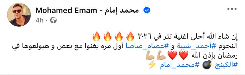 ونشر إمام خبر التعاون عبر حسابه الرسمي على فيسبوك وانستجرام معلقاً: "إن شاء الله أحلى أغنية تتر في 2026.. النجوم أحمد شيبة وعصام صاصا أول مرة يغنوا مع بعض وهيولعوها في رمضان بإذن الله".
