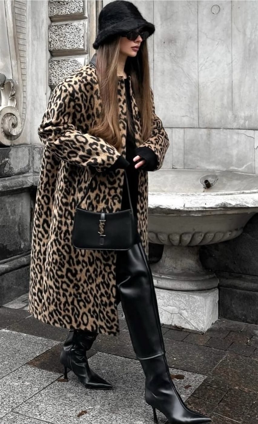للعاشقات للإطلالات الجريئة، يمكن تنسيق معطف بطبعة البقر أو الثعبان مع بوت عالي الساق وحقيبة لافتة، مع الحفاظ على بقية القطع بسيطة حتى لا تبدو الإطلالة مزدحمة.