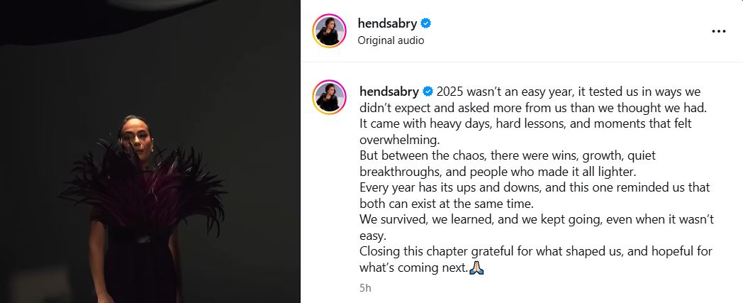 وشاركت هند صبري، جمهورها بمقطع فيديو عبر حسابها الرسمي على "إنستجرام"، رصد فيه العديد من الأحداث الفنية التي عاشتها خلال هذا العام، وعلقت قائلة: "لم يكن عام 2025 عامًا سهلاً، فقد اختبرنا بطرق لم نتوقعها وطلب منا أكثر مما كنا نظن أننا قادرون على تحمله، جاء بأيام ثقيلة، دروس صعبة، ولحظات شعرت فيها الأمور وكأنها ساحقة".