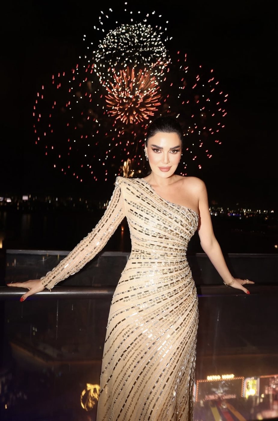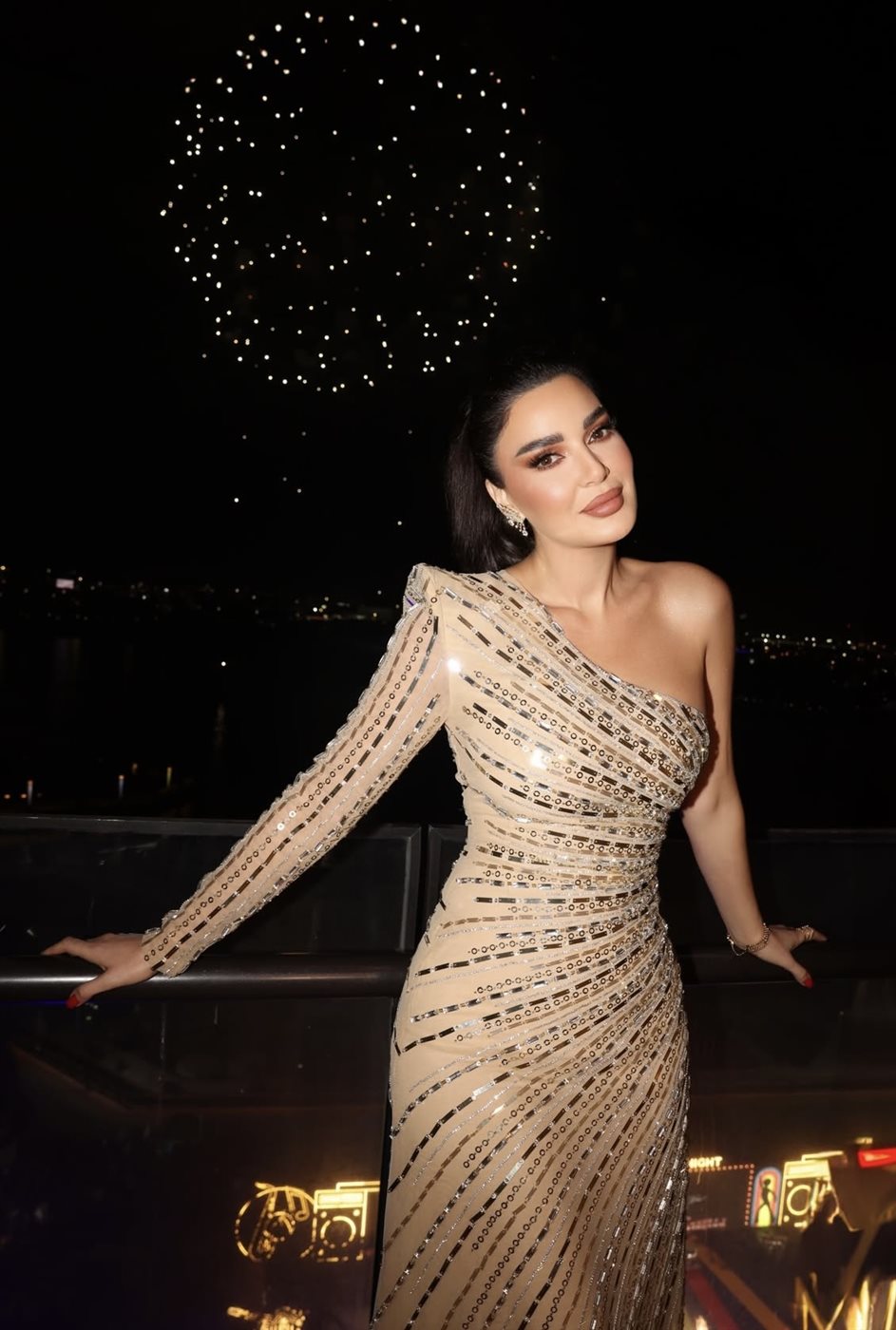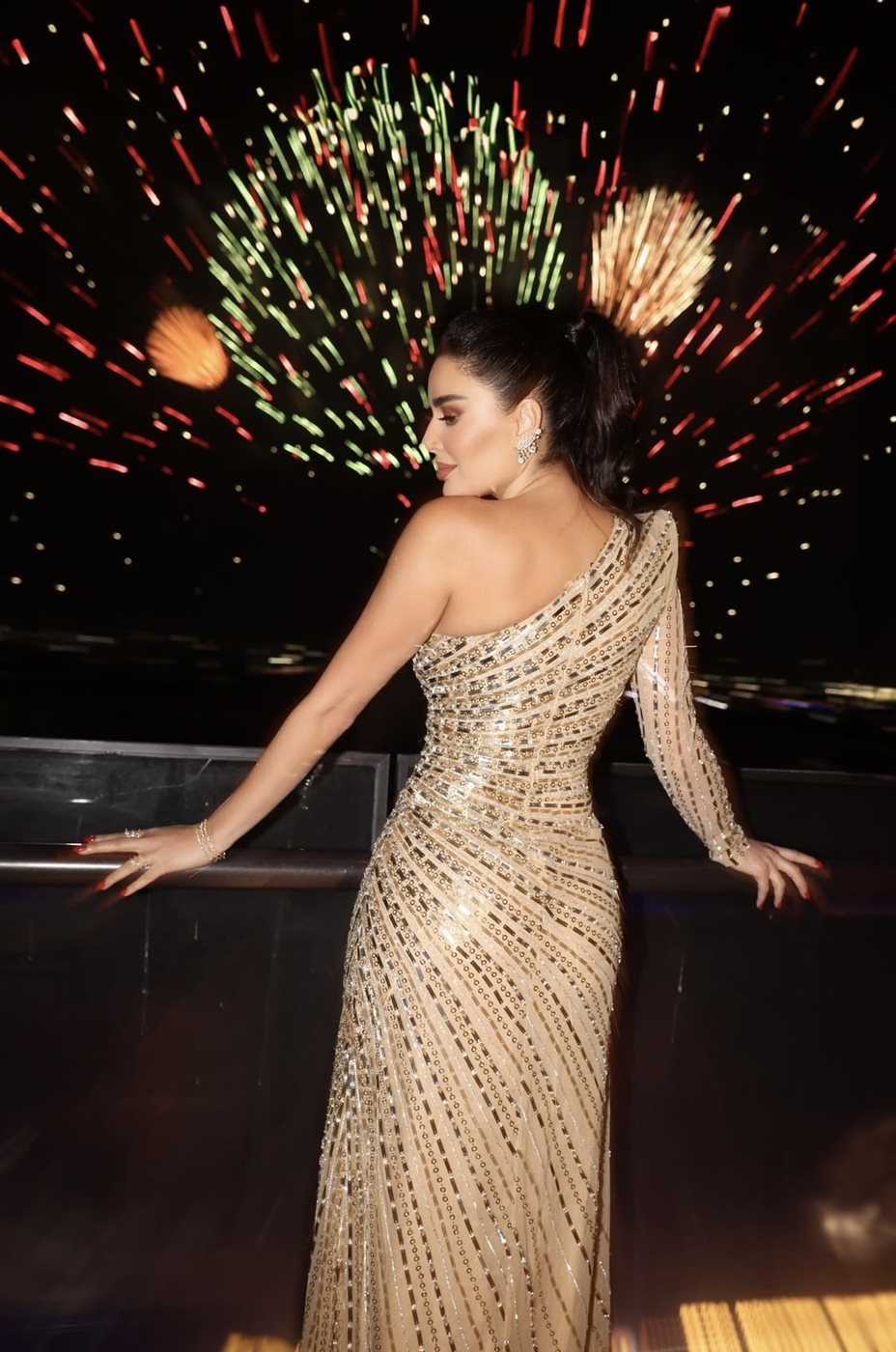 وفي التفاصيل، اختارت سيرين فستانًا ذهبيًا لامعًا بتصميم أنثوي راقٍ من توقيع طوني ورد ، جاء بقصة الكتف الواحد مع كم طويل منسدل، ما أضفى على الإطلالة توازنًا ذكيًا بين الجرأة والرقي. الفستان انسدل بانسيابية على القوام، وزُيّن بتطريزات وخطوط لامعة دقيقة عكست الضوء بطريقة متناغمة مع أجواء الاحتفال، ليحاكي بريق الألعاب النارية في الخلفية.