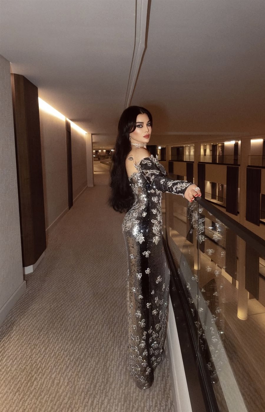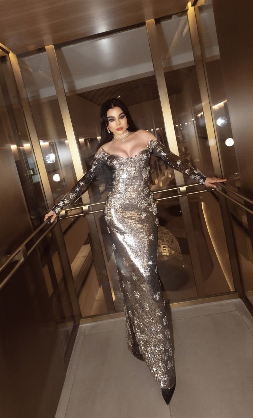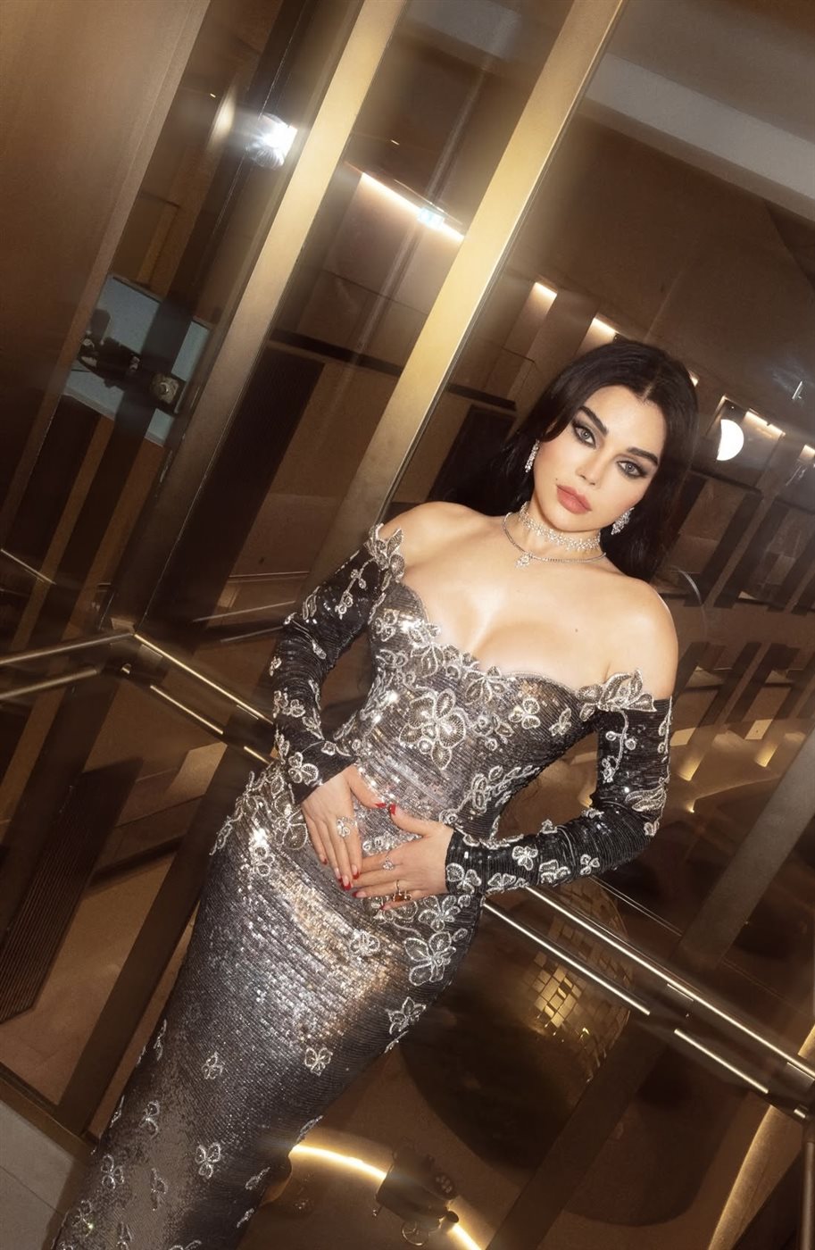 ظهرت هيفاء بفستان طويل ضيّق بقصّة أنثوية بارزة، جاء بتدرّجات اللون الميتالك الفضي اللامع، ومطرّز بتفاصيل دقيقة زادت من فخامته وبريقه تحت أضواء الحفل. التصميم تميّز بياقة مكشوفة على الكتفين (Off-Shoulder)، ما أضفى لمسة رومانسية متوازنة مع الطابع الجريء للفستان، بينما انسدل القماش بانسيابية تبرز القوام وتمنح الإطلالة حضورًا طاغيًا.