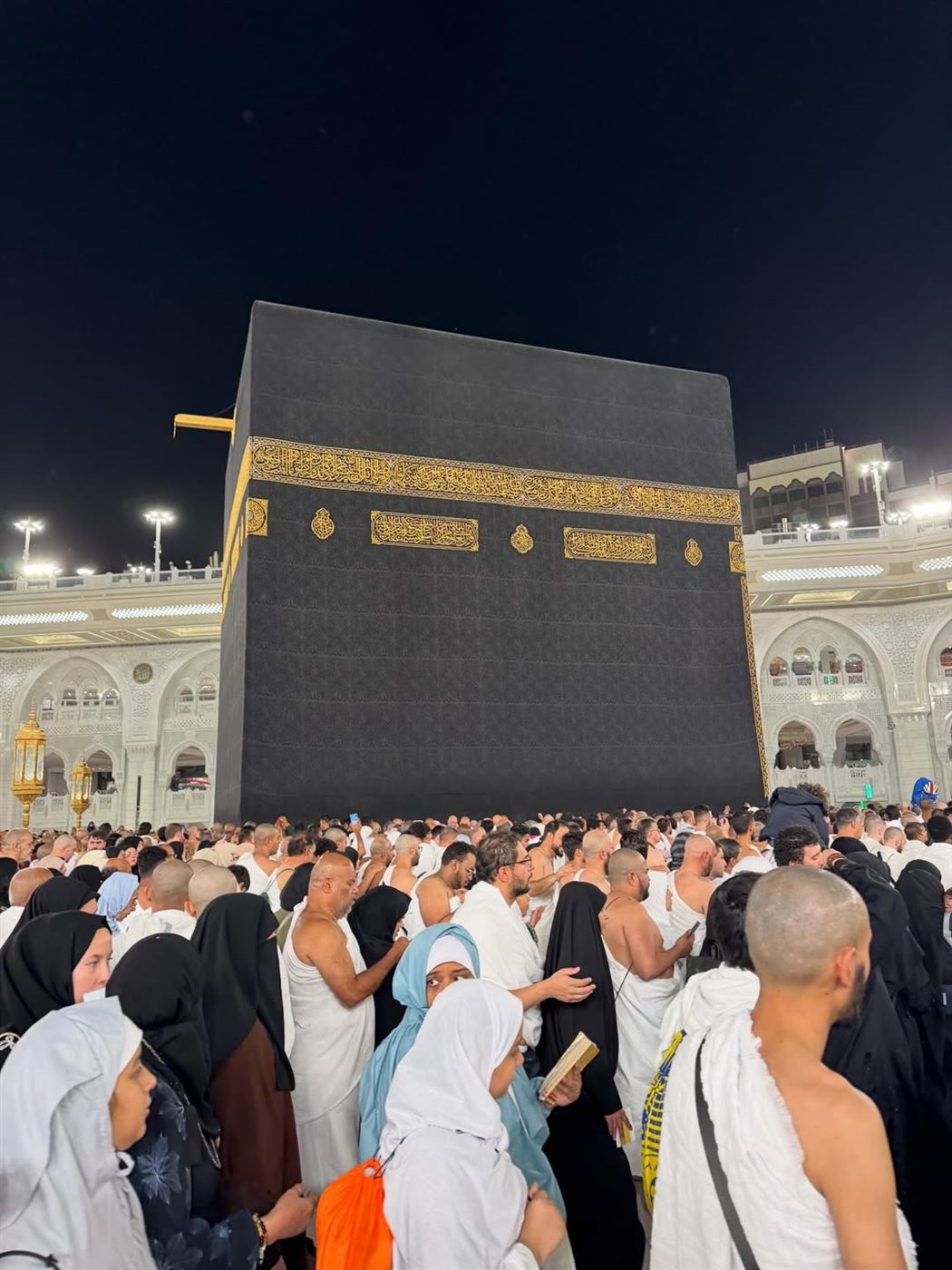 وظهرت منة شلبي، بملابس الإحرام البيضاء تقف إلى جانب زوجها أحمد الجنايني أمام الكعبة، في أجواء من الحب والرومانسية التي طغت على الثنائي.