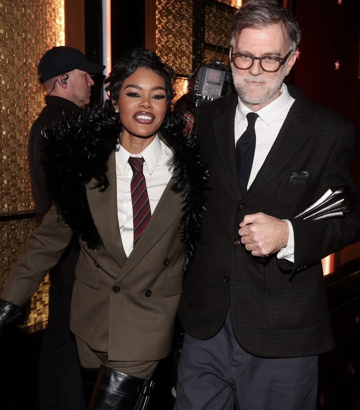 ومن بين الإطلالات التي لفتت الأنظار، برزت إطلالة تشايس إنفينيتي ببدلة ثنائية القطع باللون الأصفر الزبدي، جاءت بقصّة منسدلة ناعمة من توقيع دار Louis Vuitton، عكست توازناً مثالياً بين الجرأة والرقي. هذا اللون غير التقليدي على السجادة الحمراء منح الإطلالة طابعاً مشرقاً ومختلفاً، مؤكداً أن الموضة لم تعد حبيسة الألوان الكلاسيكية فقط، بل باتت تحتفي بالتجديد والجرأة المدروسة.