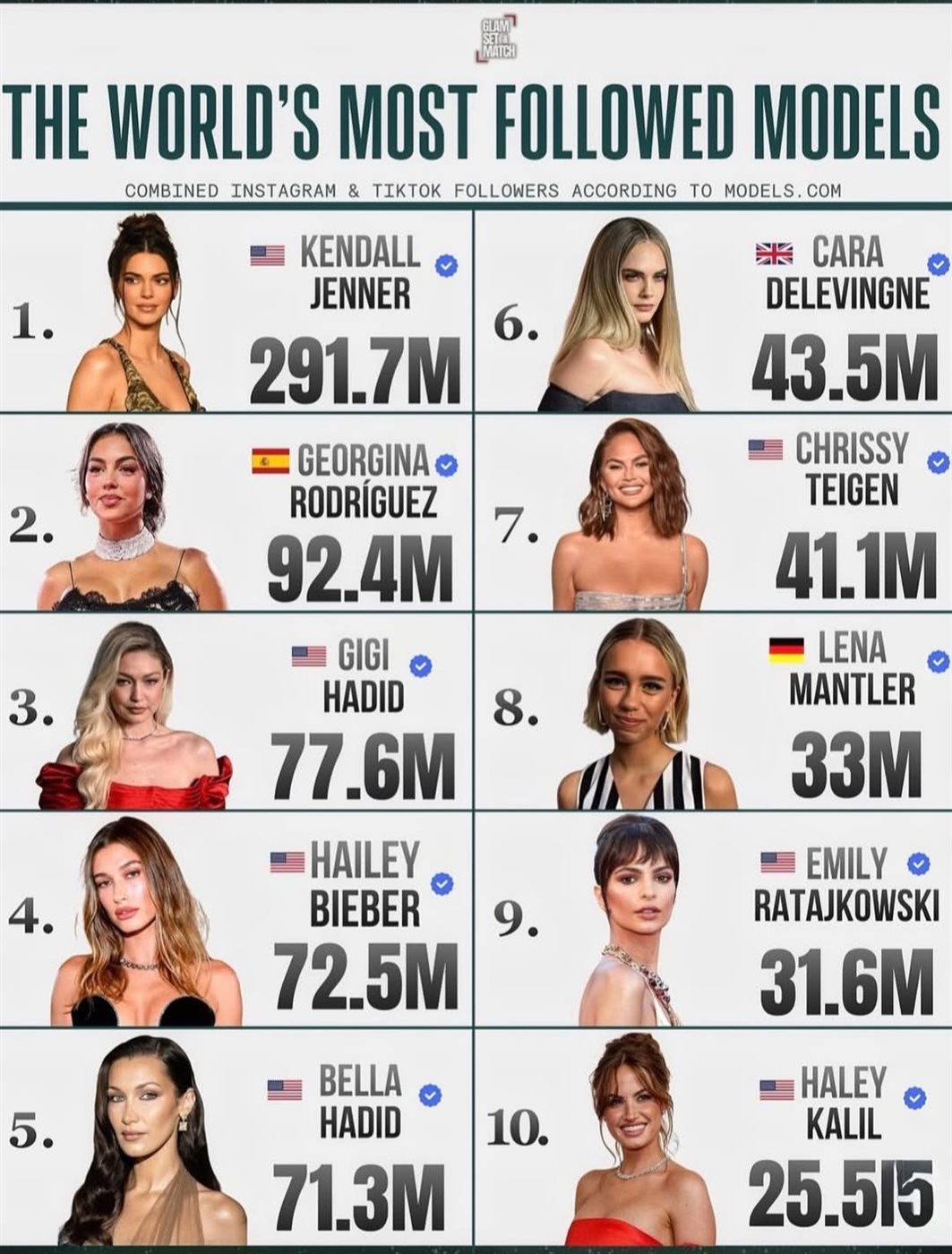 وجاءت كيندال جينر في صدارة القائمة بإجمالي عدد متابعين بلغ نحو 291.7 مليون متابع عبر مختلف منصات التواصل الاجتماعي، وفي مقدمتها إنستجرام وتيك توك وهو ما يمنحها تفوقًا واضحًا على منافساتها ويؤكد استمرار هيمنتها الرقمية على مشهد الموضة العالمي.