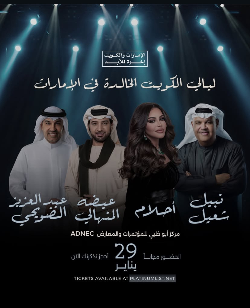 تنطلق أولى حفلات "ليالي الكويت الخالدة" مساء 29 يناير على مسرح مركز أبوظبي الوطني للمعارض ضمن فعاليات أسبوع الإمارات والكويت إخوة للأبد وتشهد الأمسية مشاركة نخبة من نجوم الصف الأول يتقدمهم الفنان الكويتي نبيل شعيل والنجمة الإماراتية أحلام إلى جانب الفنان عيضة المنهالي والفنان عبد العزيز الضويحي في ليلة يتوقع أن تشهد حضورا جماهيريا واسعا.
