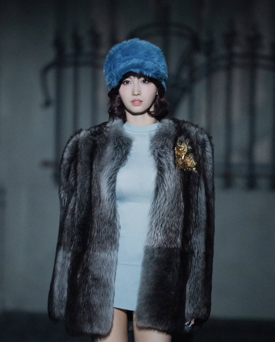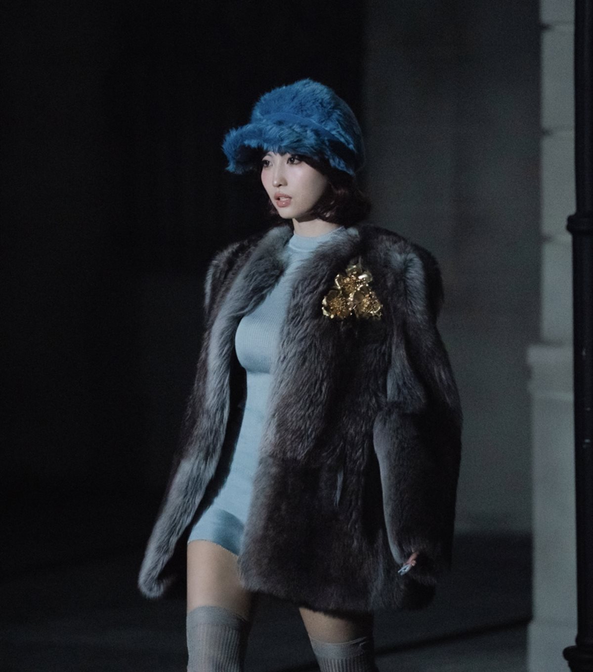 مومو، عضو فرقة ميسامو، اختارت إطلالة تحمل توقيع دار ميو ميو، جاءت بتدرجات الأزرق الباستيلي الناعمة، ما أضفى على المشهد لمسة حالمة وانسيابية تنسجم مع أجواء الأغنية. التصميم الخاص عكس حسًا شبابيًا أنيقًا، حيث امتزجت البساطة مع التفاصيل المدروسة، في أسلوب يعكس هوية الدار المعروفة بقدرتها على إعادة تعريف الأنوثة المعاصرة.