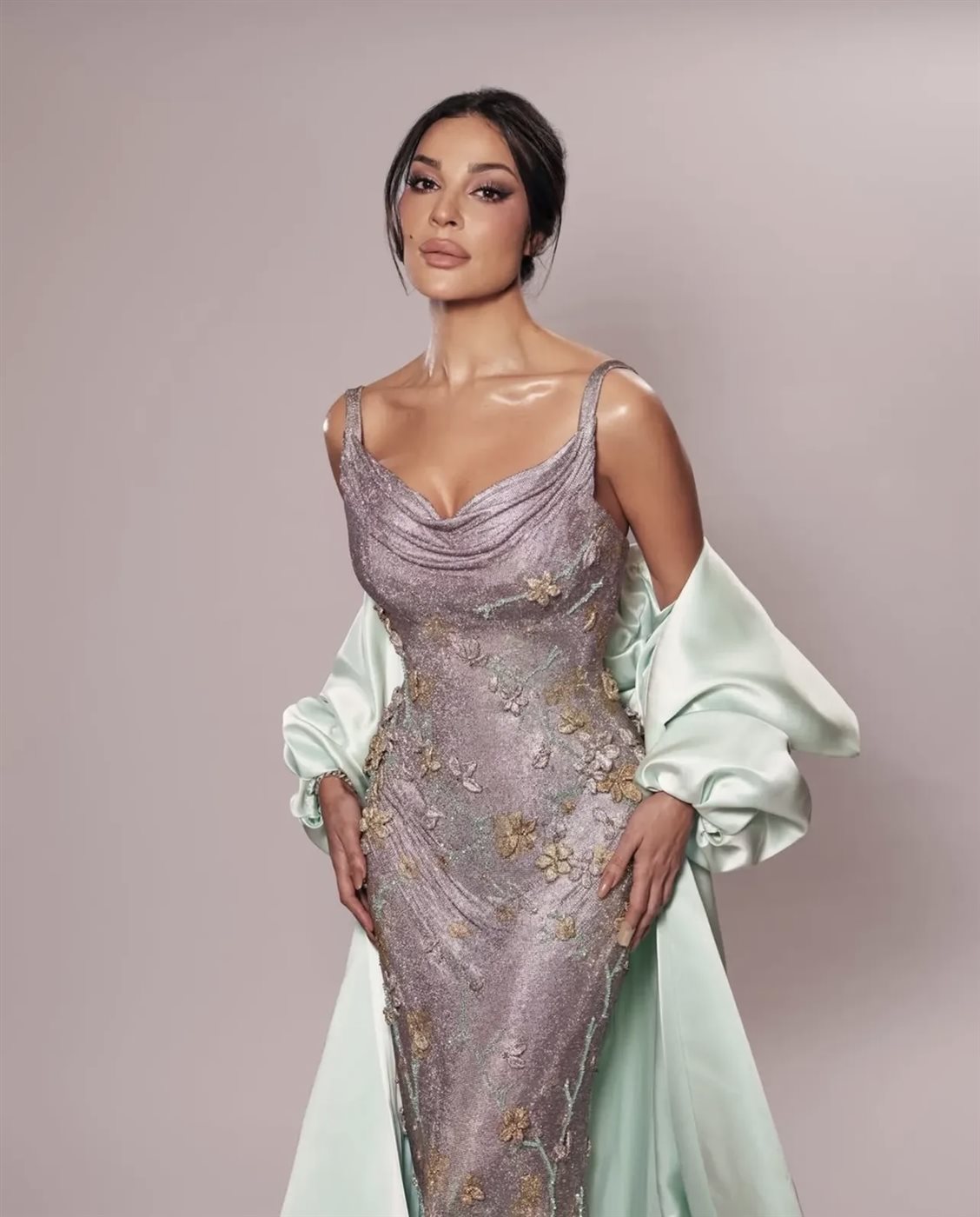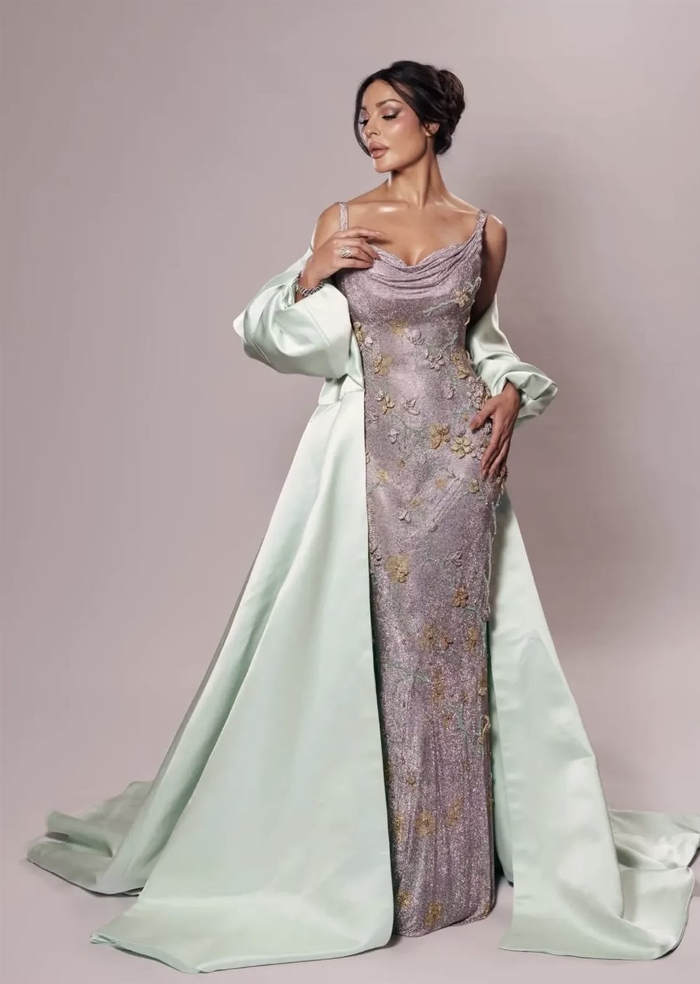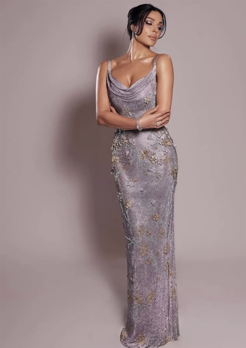 حيث برز اختيارها لفستان سهرة طويل بقصة أنثوية ناعمة، جاء بلون متدرج يميل إلى البنفسجي المطفأ مع تطريزات زهرية دقيقة بلمسات ذهبية، ما أضفى على التصميم بعدًا فنّيًا أشبه بلوحة مرسومة بعناية. قصّة الصدر المنسدلة (Draped Neckline) منحت الإطلالة نعومة وانسيابية، فيما عانق الفستان القوام بأسلوب راقٍ بعيد عن المبالغة، ليعكس توازنًا دقيقًا بين الجرأة والذوق الرفيع.