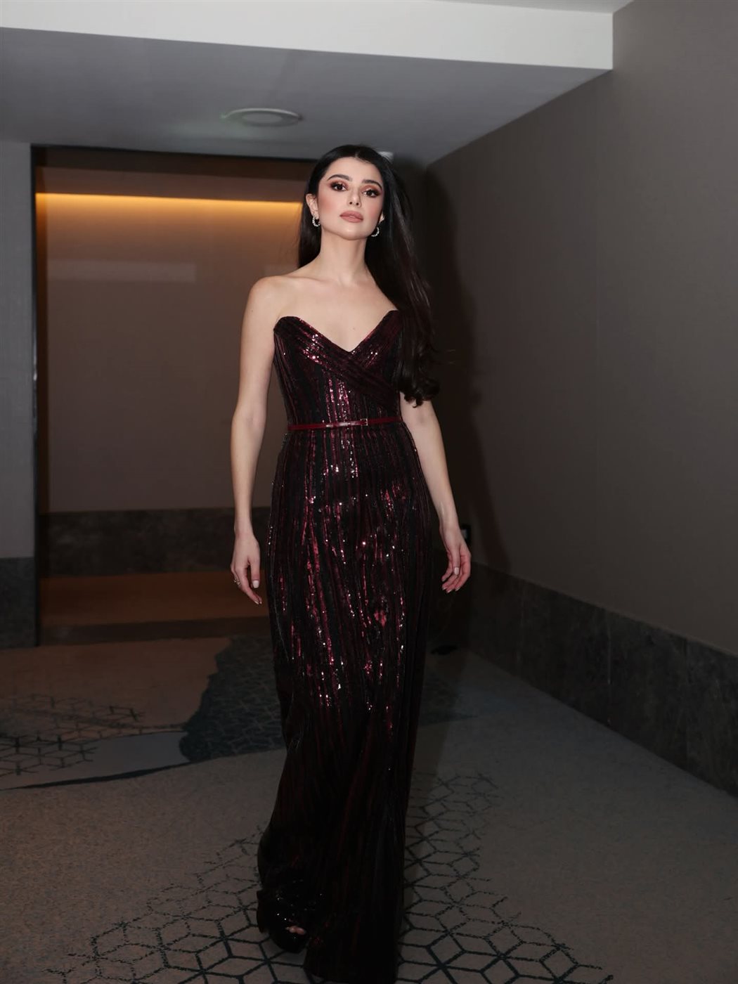 اللون العنابي بدوره منح الإطلالة عمقًا وأناقة، ليعكس حضورًا قويًا يتناسب مع طبيعة المناسبة الفنية.