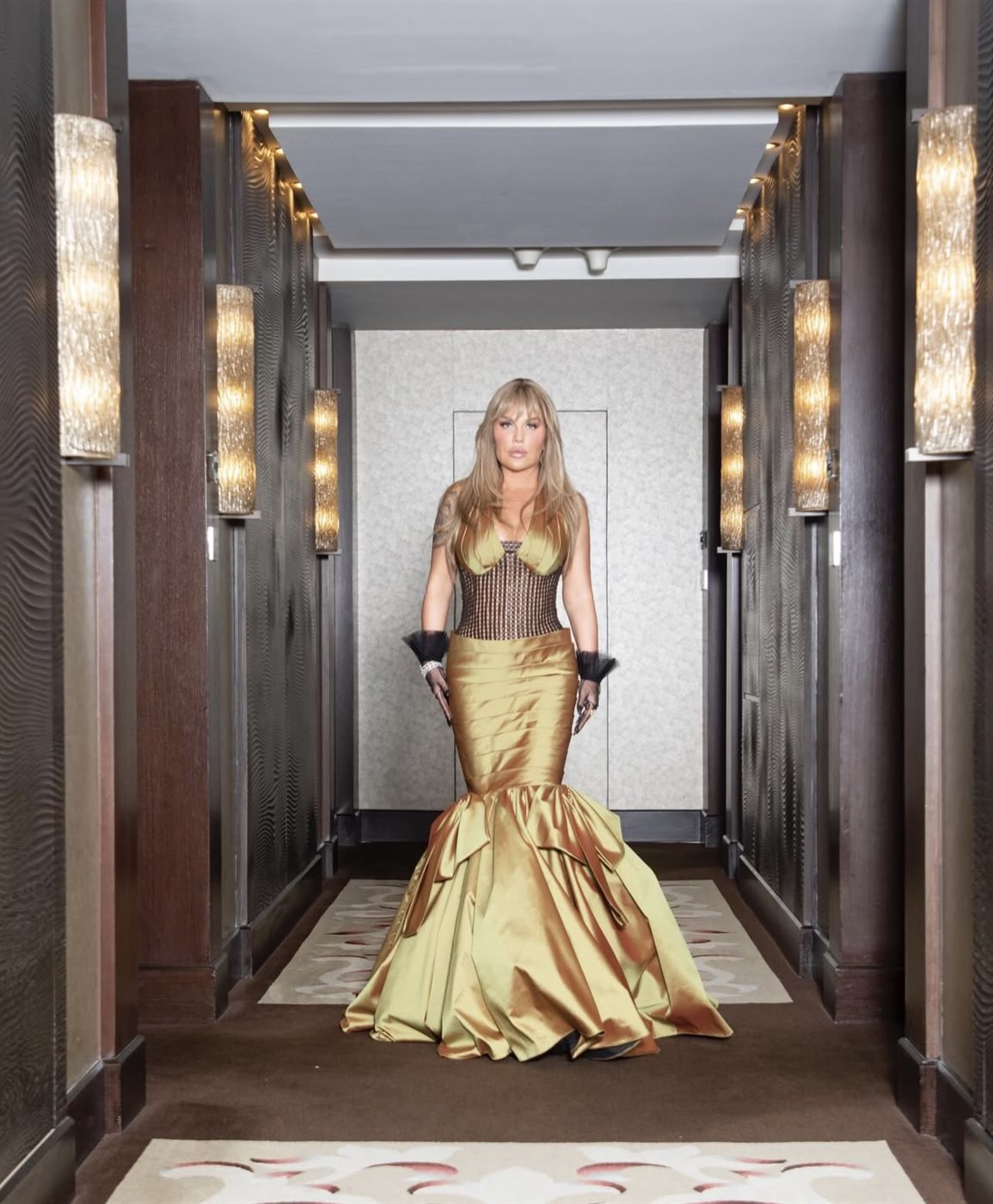 اختارت نيكول فستانًا ذهبيًا بقصّة الميرميد المنحوتة، أبرزت القوام بأسلوب أنثوي متقن. الجزء العلوي جاء بتصميم كورسيه شبكي منح الإطلالة طابعًا عصريًا جريئًا، وكسر الصورة النمطية للفساتين الكلاسيكية، فيما انسدل الجزء السفلي باتساع درامي وثنيات واضحة أضفت حركة وأناقة ملكية على التصميم. هذا التوازن بين الصرامة في الجزء العلوي والانسيابية في الجزء السفلي خلق لوحة بصرية جذابة تعكس فهمًا دقيقًا لفن اختيار القصّات.