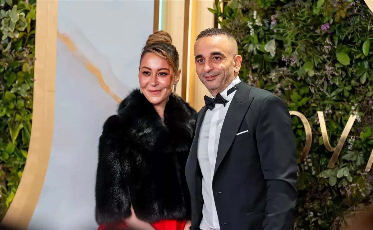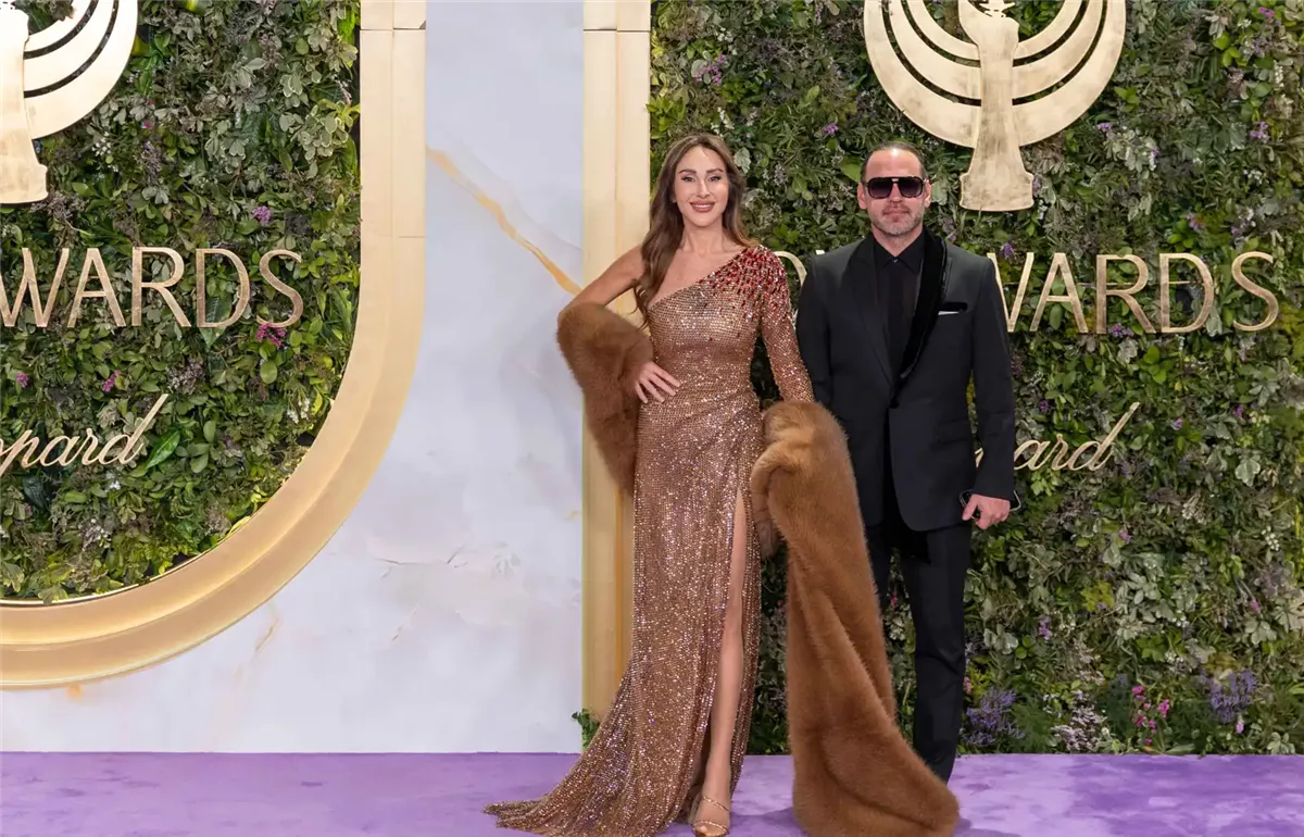 ظهرت الفنانة ورد الخال بإطلالة أنيقة بفستان بني لامع مع فرو بني فيما تألق زوجها باسم رزق ببدلة سوداء كلاسيكية ليكونا ثنائيا متألقا على السجادة.